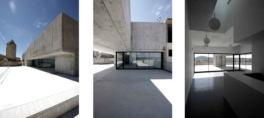El pueblo se levanta sobre una pequeña loma. El pueblo se muestra como acumulación de casas. Su escala es doméstica. Las casas se situan sobre un fuerte desnivel. El pueblo es de piedra. El pueblo es hermético, cerrado, ciego, opaco. El edificio se situa en un extremo del pueblo. En el punto más elevado, con vistas sobre el Pla de Mallorca. La parcela presenta un desnivel de 9m entre la calle de acceso y el futuro paseo inferior. El edificio aprovecha este desnivel. Se plantea excavado dentro del terreno, de apariencia petrea, esculpido en la roca. El resultado es un edificio semienterrado que genera una plaza sobre sí mismo y a la misma cota que la calle. Se construye en hormigón, liso por la cara interior y muy rugoso en la exterior. Gracias a este relieve –también presente en las casas del pueblo– el tiempo, la pátina añadida por el paso de los años entrara a formar parte de la arquitectura.
