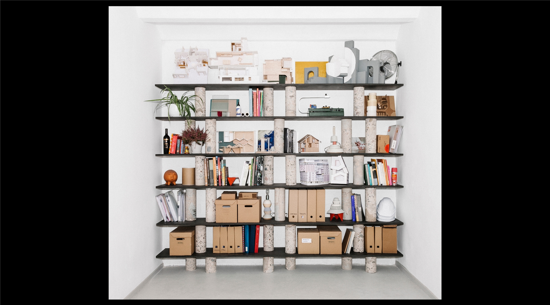 Estantería de baldas de DM hidrófugo negro y testimonios de hormigón extraídos del templo de la Sagrada Familia como soportes, de ahí su nombre. Se trata de una pieza de mobiliario que funciona por gravedad, de forma que se apila una balda sobre otra, igual que el tiempo apilará los libros y los objetos que la completen. Los soportes testimoniales que construyen los niveles se colocan al tresbolillo desmaterializando el descenso de las cargas verticales para alcanzar un equilibrio bello