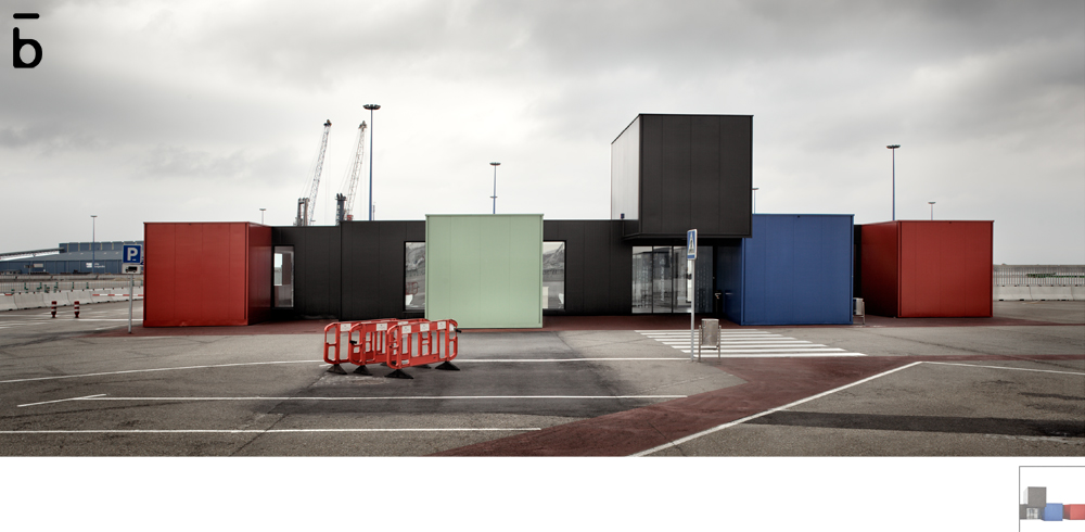Situado en el Muelle de la Osa, en el puerto del Musel, no existe una parcela a la que ceñirse. Se plantea como un edificio modular realizado enteramente con construcción en seco, que se abre sobretodo hacia el mar. Los módulos tienen 3.60m de ancho y una profundidad máxima de 15m, con una superficie construida de 360 m2. La fachada es de panel industrial de chapa lisa en diversos colores, un material muy común en el entorno en el que se encuentra.