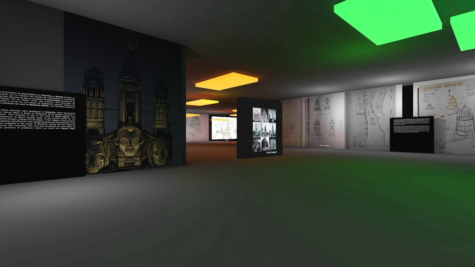 Entre finales de los 2010 y principios de 2020 el videojuego ha hecho también incursión en la educación de arquitectura a nivel de grado y posgrado, así como en la investigación académica. La existencia de volúmenes colectivos exclusivamente dedicados al cruce entre ambos campos es prueba de ello.[2] Del mismo modo, los videojuegos hacen aparición en las aulas de las ETSAs españolas cada vez con más asiduidad. Las aproximaciones a esta temática de estudiantes de TFG, TFM y doctorado han aumentado progresivamente en número y reducido su timidez, pasando de “presentar” el panorama actual a “profundizar” en sus influencias, impactos y modos de hacer (Figura 2). De hecho, en mayo de 2022 se inauguró la primera exposición de TFGs de arquitectura y videojuegos titulada Gaming Through Architectural Drawing y contenida 100% en el metaverso, dentro del centro cultural Meetaverse. Gracias al apoyo de Fundación Arquia, el Ministerio de Cultura y Deporte, Etermax y la Universidad de Granada, esta exposición reunió a arquitectos, arquitectas y estudiantes de distintos lugares de España y Colombia junto a importantes figuras de la divulgación y la docencia en arquitectura, todos ellos reunidos en un espacio virtual que les permitía interactuar de una forma dinámica y lúdica (Figura 3). Estas investigaciones emergentes, al igual que las de otros académicos llegados a los game studies desde disciplinas distintas a la arquitectura, se cruzan con temáticas prioritarias tales como los estudios de género, los movimientos decoloniales, las problemáticas de raza, las dinámicas del capitalismo tardío y el activismo social. No en vano, el programa Horizon Europe de la Comisión Europea ha dedicado en 2022 un presupuesto de entre dos y tres millones de euros al estudio de cómo los “juegos y la cultura dan forma a nuestra sociedad”.[3] Así, las aproximaciones ya establecidas en la disciplina arquitectónica y la carga conceptual propia de estas nuevas tendencias científicas son aplicadas al estudio de un ámbito innovador como es la industria del videojuego, generando un triángulo virtuoso entre metodología disciplinar, marco y medio.