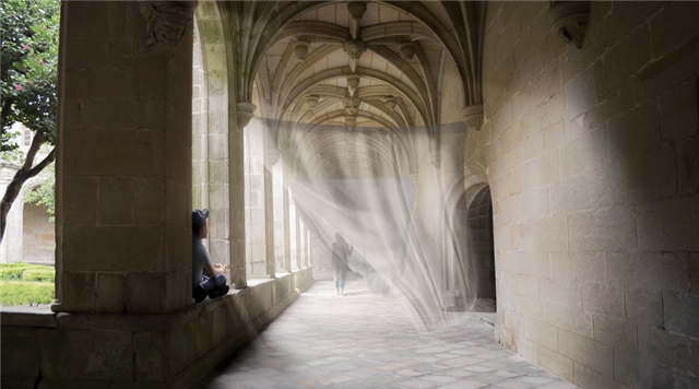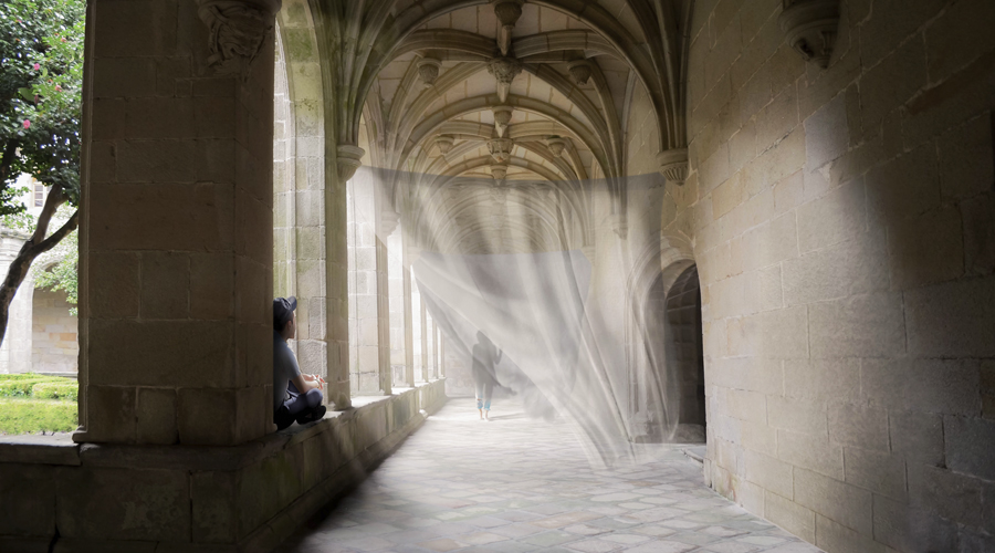 Éste es un ejercicio de repetición. Repetir planos de un blanco translúcido para ser atravesados. Planos de un tejido ligero, ondeando al viento de este claustro, en la dirección del camino marcado por nuestros pasos. Este tejido de cierta transparencia al ser colocado en secuencia ofrece un cierto grado de opacidad. La opacidad se va perdiendo al caminar en la dirección perpendicular al transitar. Pero al doblar la esquina y quebrar el recorrido, otra vez regresa esa confusión de no ver bien el fondo de la escena.