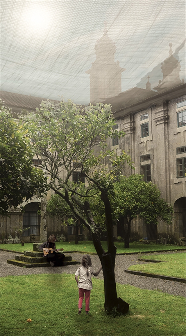 “Armónicas discordancias” es un gesto arquitectónico que indaga en las posibilidades de un espacio conocido: el claustro del monasterio de Poio (Galicia). Un espacio para ser transitado. Este gesto quiere ser una variación sobre el transitar cotidiano por este espacio claustral, generalmente desnudo.