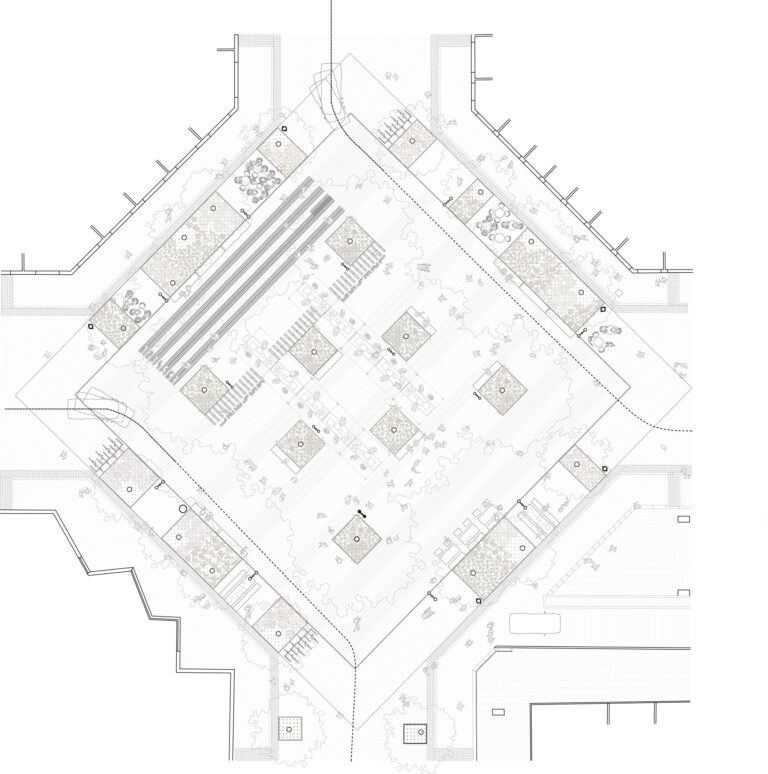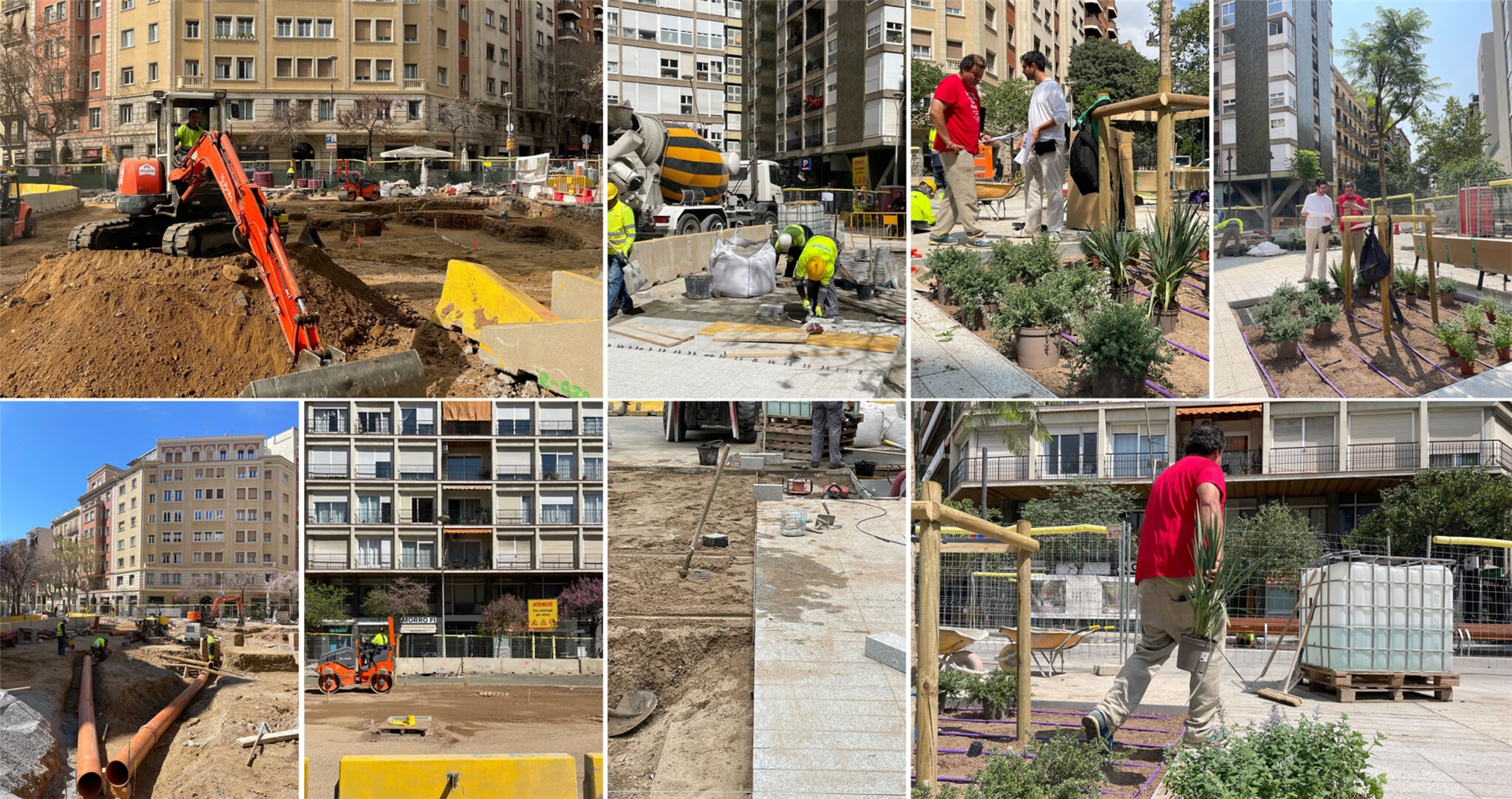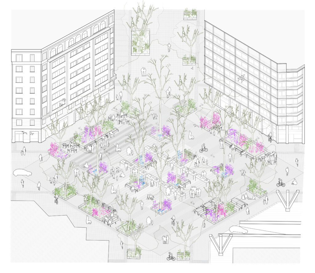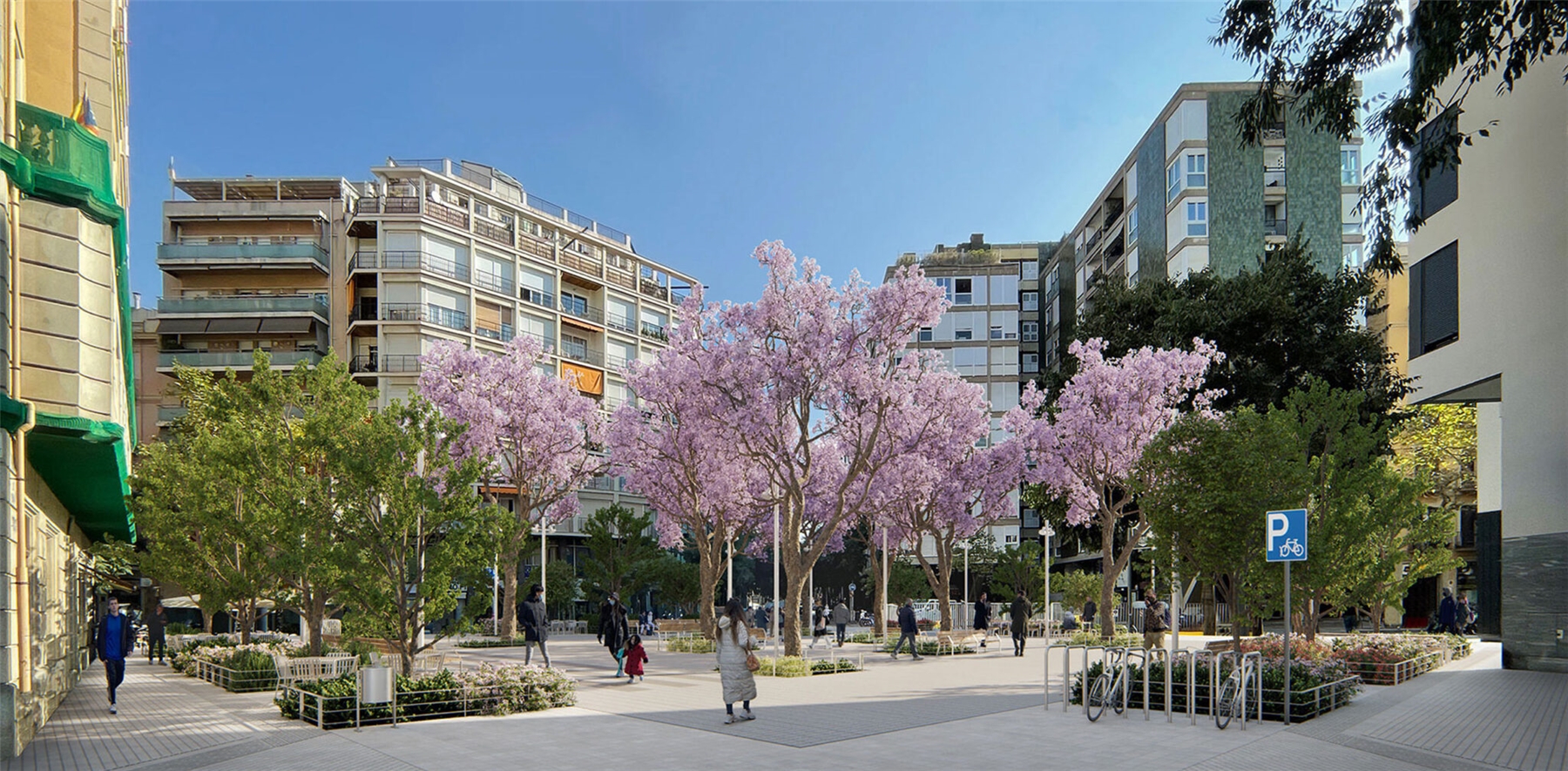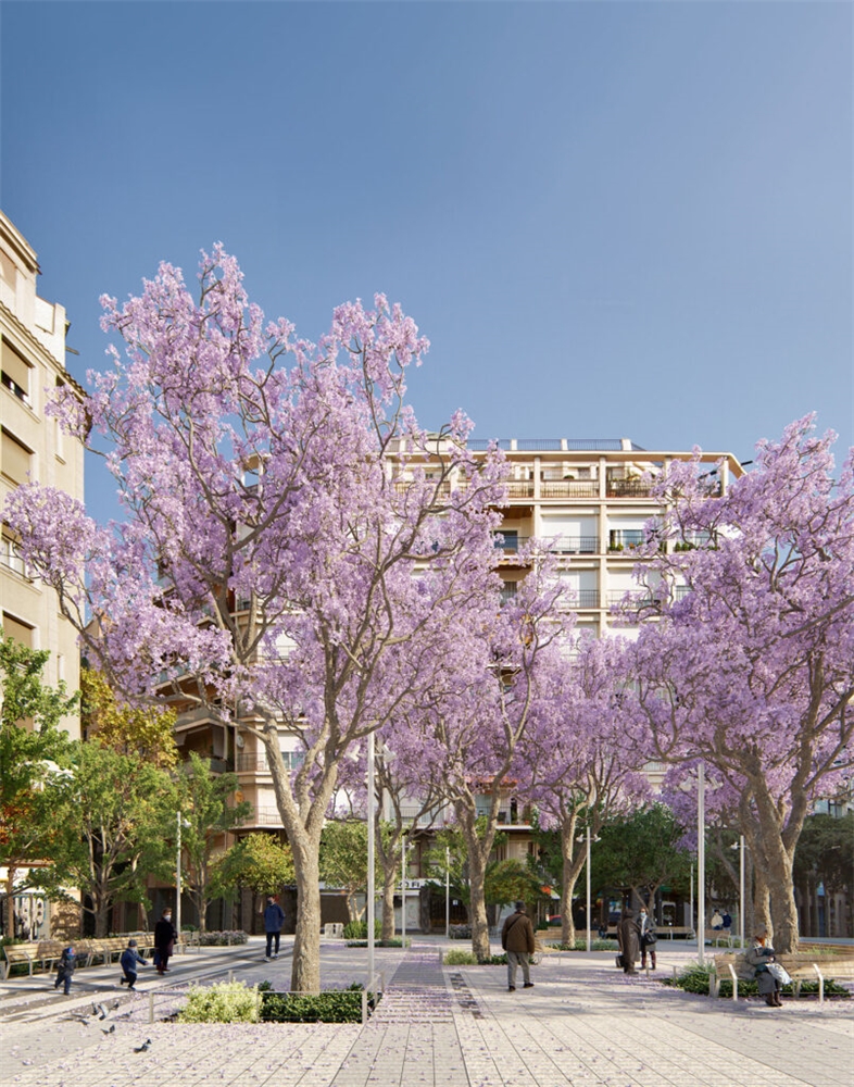 El diseño de la nueva plaza, en la intersección entre Consell de Cent y Comte Borrell, está destinado a ser una plataforma urbana para dar cabida al uso activo del mercado semanal de los domingos y la celebración de las fiestas del barrio. El diseño se aborda de manera radial y sistemática: una gran plataforma de piedra natural alberga 8 árboles de jacarandá en su centro, que generan una amplia área de sombra central y zona de descanso. En contraste con el centro, el anillo perimetral de árboles existentes se refuerza en su mayoría con arbustos y árboles más pequeños. Las áreas de estar al aire libre de los bares se encuentran en esta zona. Entre el centro y este perímetro verde hay flujos de tráfico rodado. Todo el drenaje de aguas pluviales se produce mediante bio-retención, favoreciendo el crecimiento de vegetación para permitir más sombra, reduciendo así el efecto de isla de calor en el centro de la ciudad.