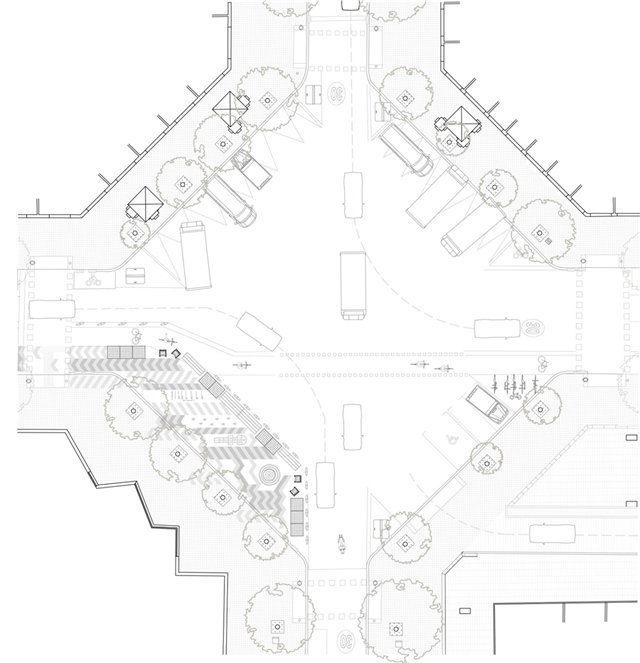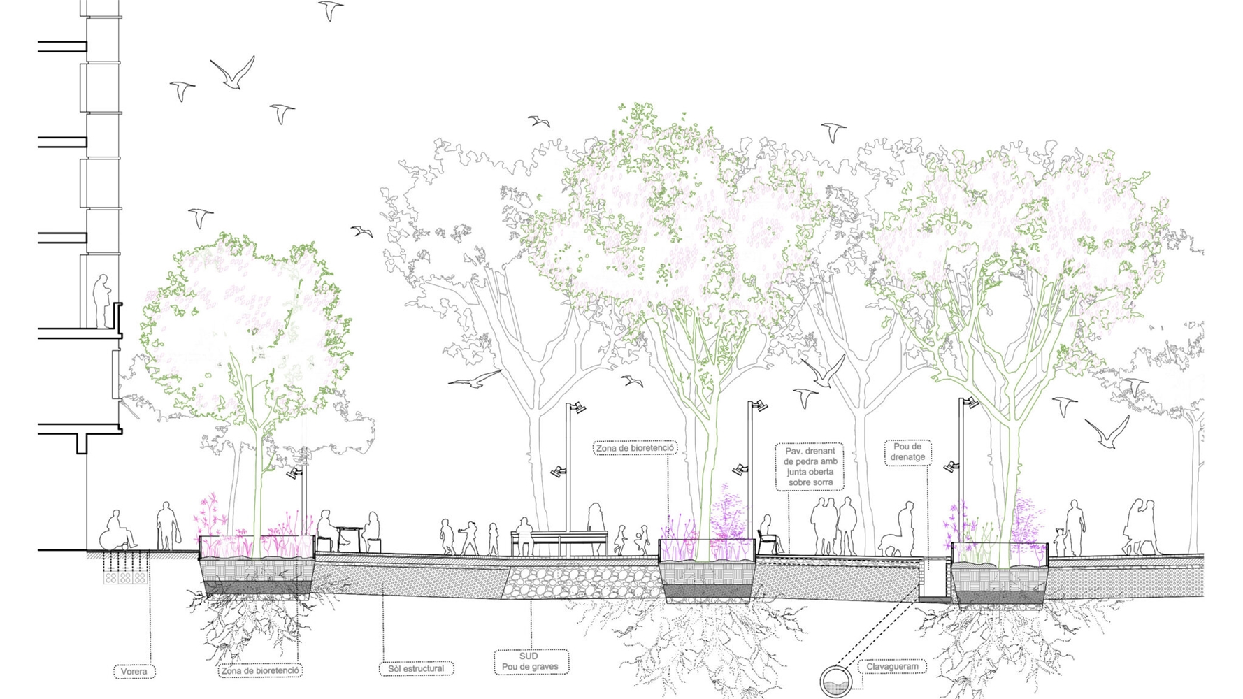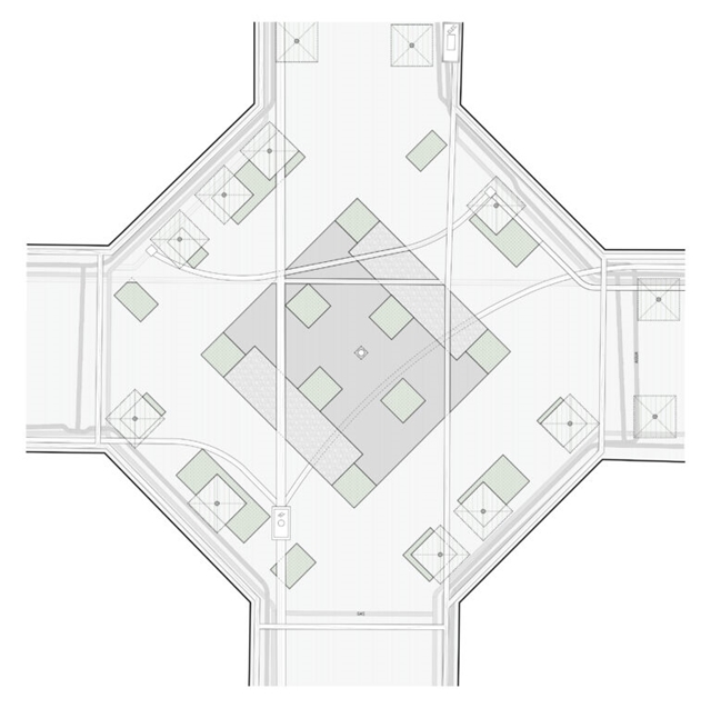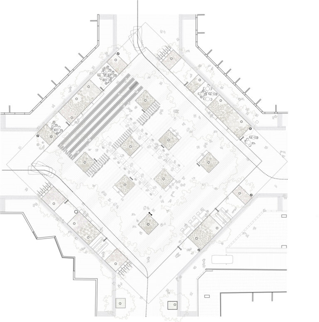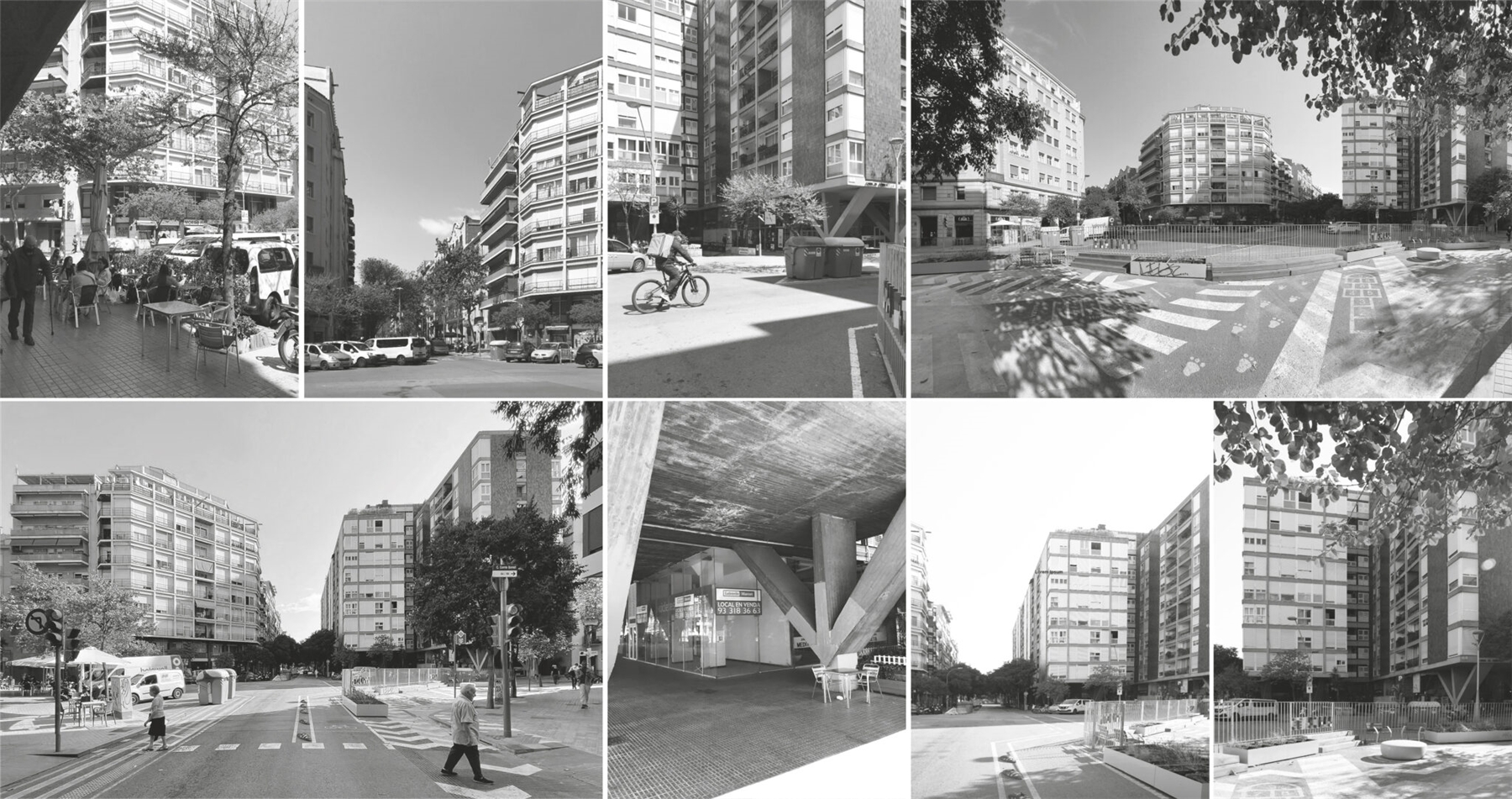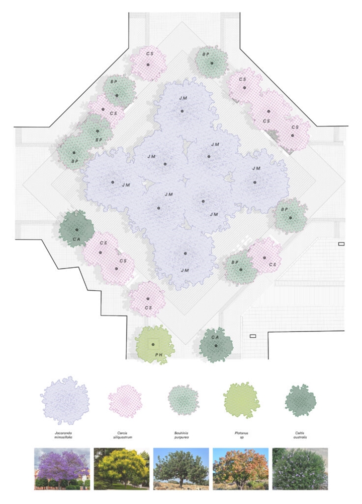 El diseño de la nueva plaza, en la intersección entre Consell de Cent y Comte Borrell, está destinado a ser una plataforma urbana para dar cabida al uso activo del mercado semanal de los domingos y la celebración de las fiestas del barrio. El diseño se aborda de manera radial y sistemática: una gran plataforma de piedra natural alberga 8 árboles de jacarandá en su centro, que generan una amplia área de sombra central y zona de descanso. En contraste con el centro, el anillo perimetral de árboles existentes se refuerza en su mayoría con arbustos y árboles más pequeños. Las áreas de estar al aire libre de los bares se encuentran en esta zona. Entre el centro y este perímetro verde hay flujos de tráfico rodado. Todo el drenaje de aguas pluviales se produce mediante bio-retención, favoreciendo el crecimiento de vegetación para permitir más sombra, reduciendo así el efecto de isla de calor en el centro de la ciudad.