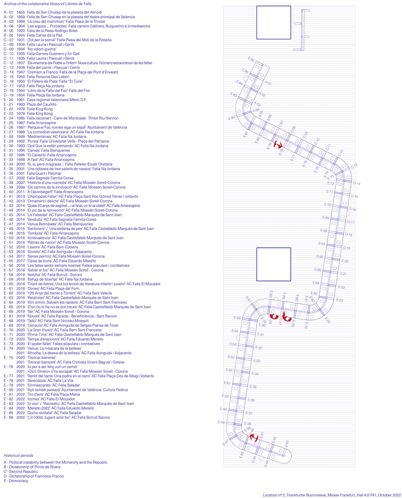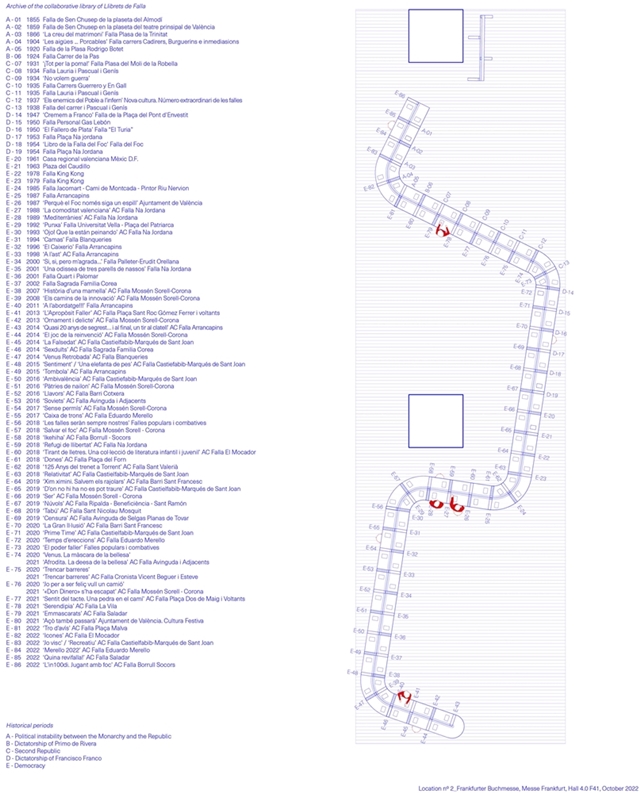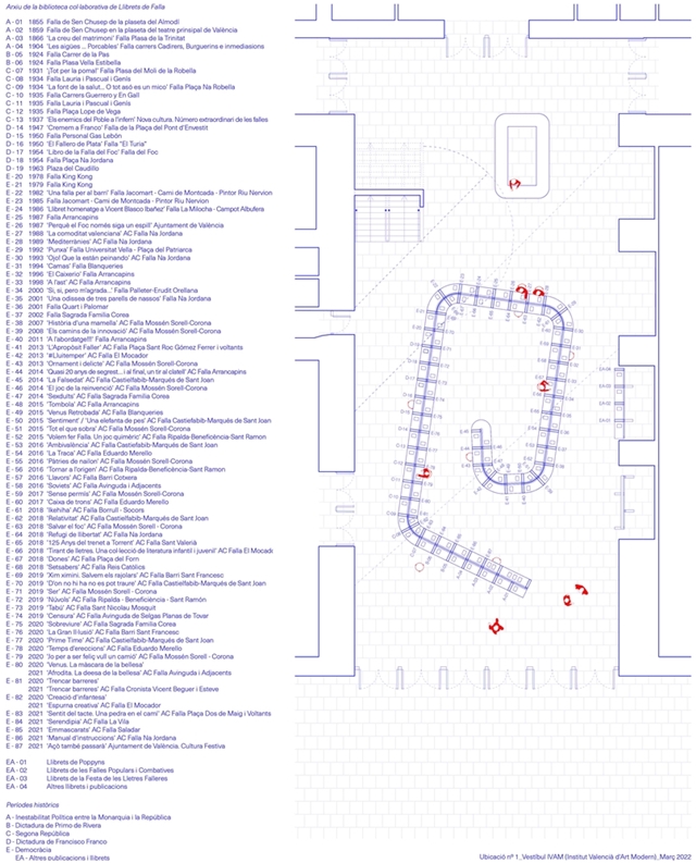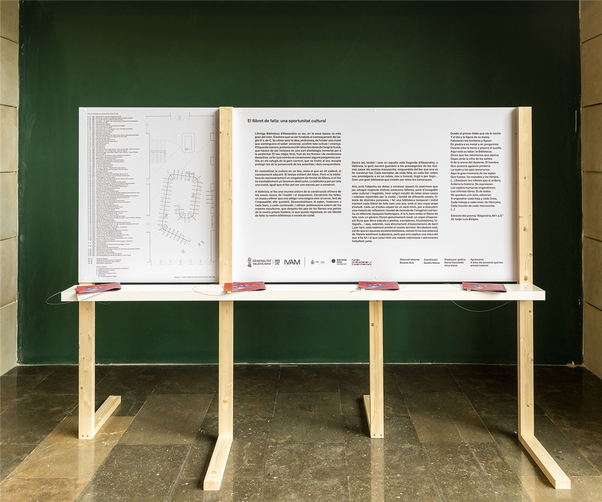 Durante las Fallas, la principal festividad de València, una serie de esculturas de gran tamaño llenan las calles de la ciudad. Sin embargo, para dar tradicionalmente paso a la primavera, estas grandes esculturas se queman la noche del 19 de marzo. De este ritual colectivo, el único legado material que cuenta su historia lo constituye una serie de pequeños libros, conocidos como llibrets de falla, que editan cada una de las asociaciones festivas de la ciudad. Así pues, el objetivo del comisariado del proyecto es dar a conocer este rico patrimonio que nace directamente del asociacionismo, por sus posibilidades culturales y creativas en contacto con las personas. El proyecto se resuelve mediante una arquitectura efímera que hace de biblioteca temporal, archivando algunos de estos llibrets de falla: aquellos que fueron seleccionados por tener un valor sobresaliente dentro de la historia de la celebración.