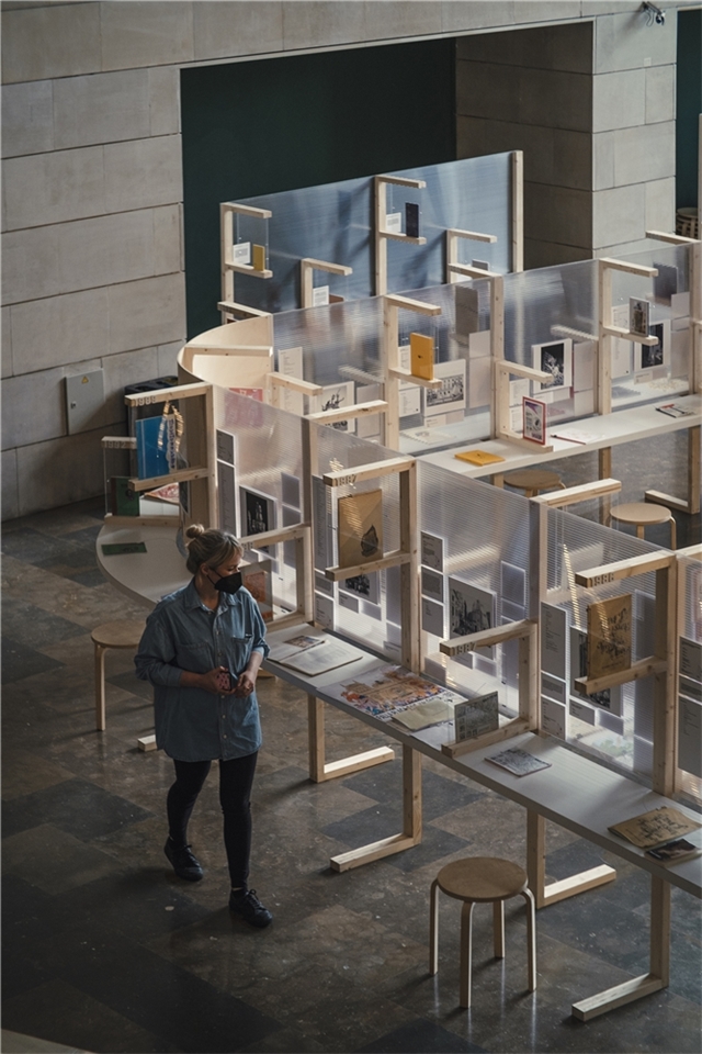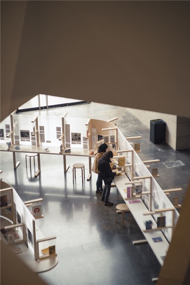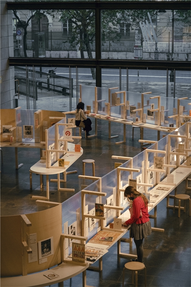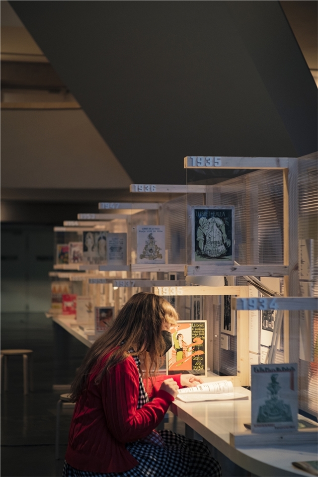 La arquitectura lineal que resuelve este programa ordena cronológicamente todos los libros, dando una lectura histórica muy sencilla, según una línea continua sinuosa que dilata o contrae el espacio público de circulación en el que se inserta. Así pues, en tanto que recorrido cronológico, permite entender rápidamente la evolución gráfica de las publicaciones, así como el contexto político en el que se realizaron. Y lo hace en perpendicular al sentido de circulación del usuario, de forma que, en perspectiva y gracias al diseño a tresbolillo de los archiveros, en lo general permite entender la evolución de un periodo histórico concreto de un solo golpe de vista. Sin embargo, al mismo tiempo y en lo particular, la arquitectura también permite una lectura sosegada de cualquier ejemplar, con un espacio individual de estudio, acotado visualmente por las cartelas informativas y los propios libros, elementos que se sitúan a la cota a la que el usuario se sienta. No obstante, de pie, el usuario percibe el espacio con mayor transparencia. Así pues, se ha trabajado esta doble escala, general y particular, según la altura de los ojos del usuario.