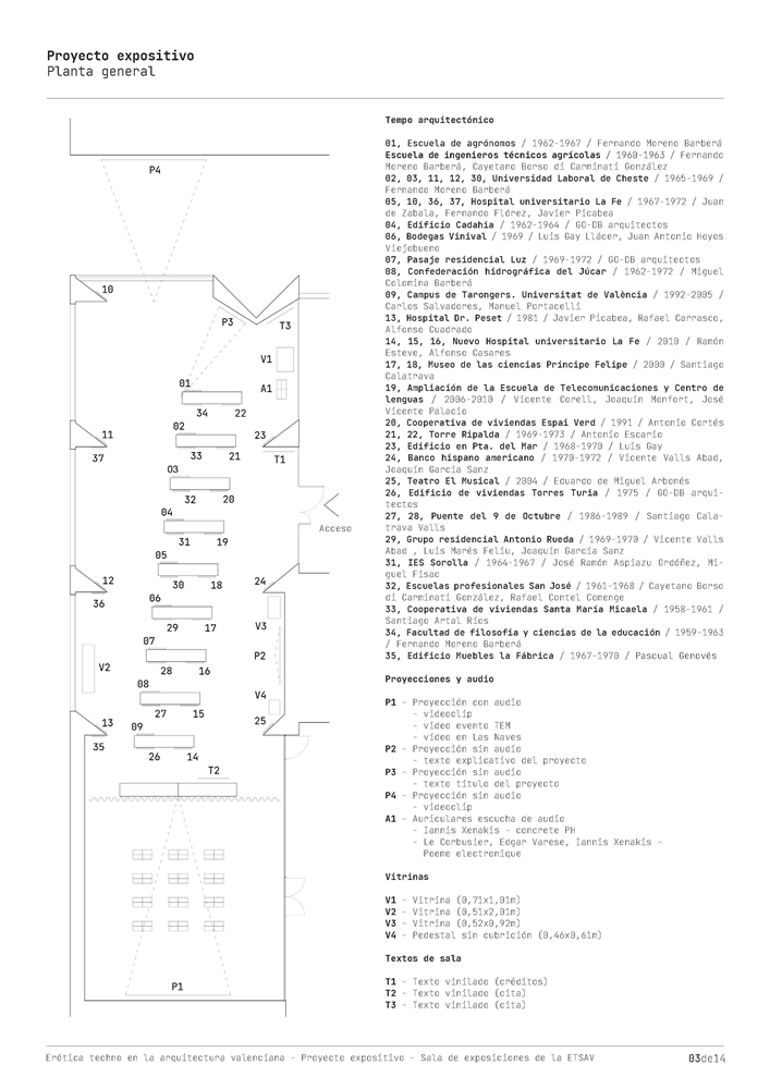 Dentro de la exposición y del libro homónimo, se incluye un catálogo de edificios valencianos de la modernidad que son reinterpretados desde esta perspectiva. Edificaciones como la Escuela de Agrónomos (1962-1967), la Facultad de Filosofía y Ciencias de la Educación (1959-1963), el Teatro El Musical (2004) o el icónico Hospital universitario La Fe (1967-1972) se presentan como ejemplos de arquitectura moderna caracterizados por sus ritmos estructurales, materiales expuestos y claros patrones repetitivos que remiten a los mismos principios que rigen la música techno.
