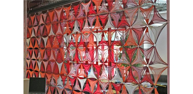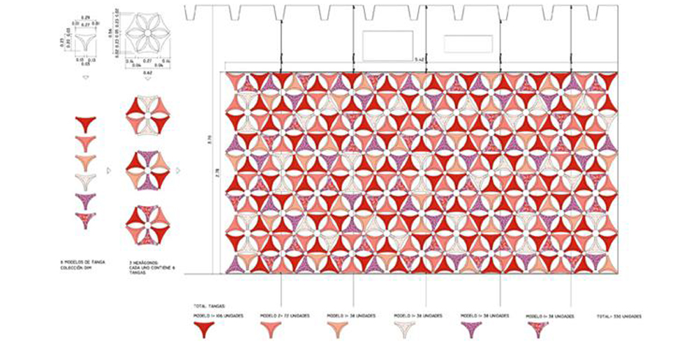 Una cortina de 6 x 3 metros, realizada con la colección de tangas DIM de la temporada, caracteriza la recepción formando un tejido abstracto y colorido.