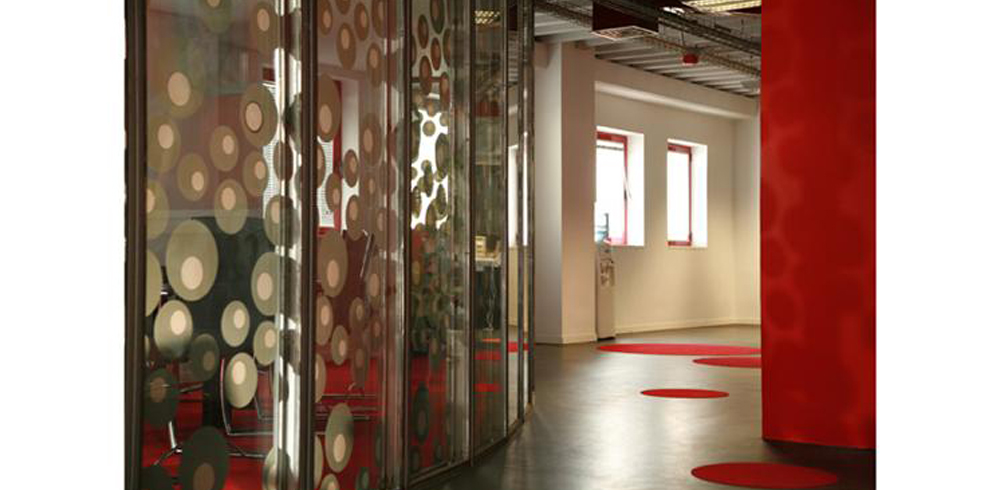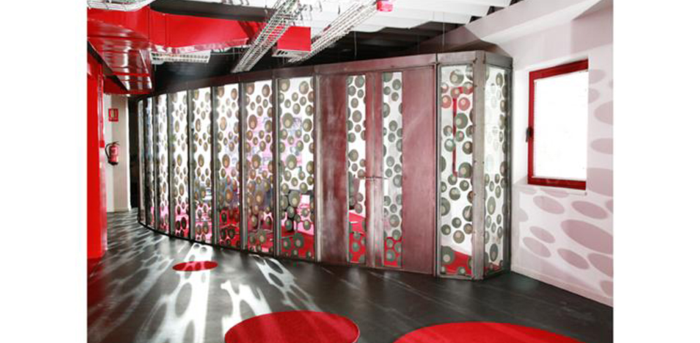 Dado el bajo presupuesto disponible, así como el poco tiempo previsto para las obras, se decidió mantener intacta la infraestructura general de la nave (huecos de fachada y carpinterías, zonas húmedas, escaleras de conexión vertical y el sistema de aire acondicionado) optando por una solución espacial diáfana y flexible. Se potenciaron las dos estancias más representativas, recepción y sala de reuniones, caracterizando el resto del espacio a través de un único lenguaje formal basado en el empleo del color y el uso de los materiales que definieran la identidad corporativa.