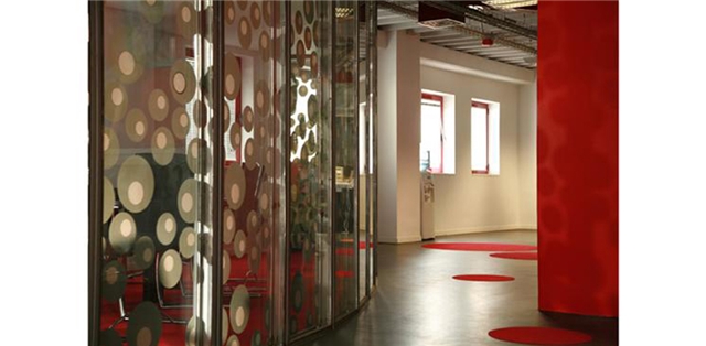 Un mobiliario modular articula las áreas de trabajo, adaptándose a las necesidades de cada puesto. Los pocos despachos existentes se independizan con un cerramiento de vidrio, con mensajes serigrafiados, permitiendo el paso de una luz matizada pero impidiendo la transmisión del sonido.
