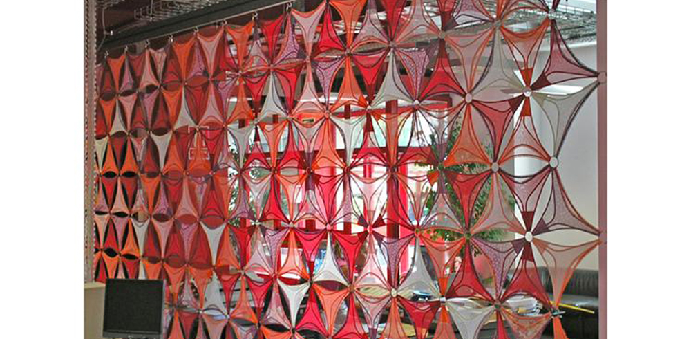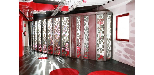 El espacio de recepción se caracteriza con una cortina de 6 x 3 metros realizada con la colección de tangas DIM de la temporada, formando un tejido abstracto y colorido, que independiza los puestos de trabajo que se sitúan tras ella, sin impedir la entrada de luz y ventilación a los mismos.
