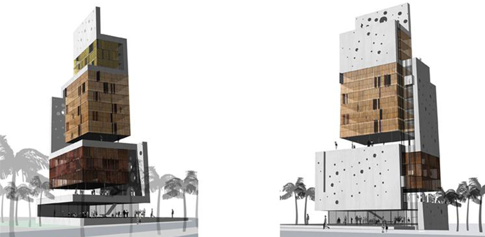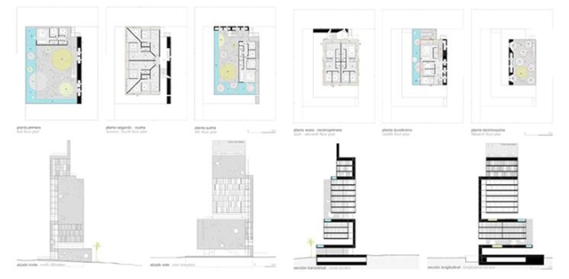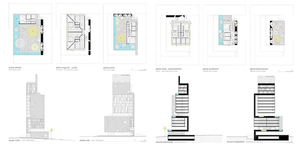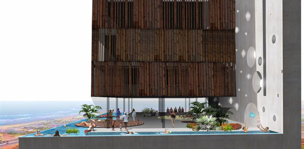Ante la imposibilidad de generar los servicios comunes y jardines en horizontal, éstos se plantean en altura, ganando al mar como nuevo horizonte. El espacio público trepa por la torre dando lugar a plantas ajardinadas, y atrios abiertos. Piscinas, jardineras y areneros quedan embebidos en un escultórico pliegue de hormigón que estructura la torre en 3 bloques diferentes, determina sus orientaciones predominantes y la ubicación del espacio posterior de circulación. Éstos últimos van variando conforme se asciende, resaltando la condición isótropa e icónica de la torre.