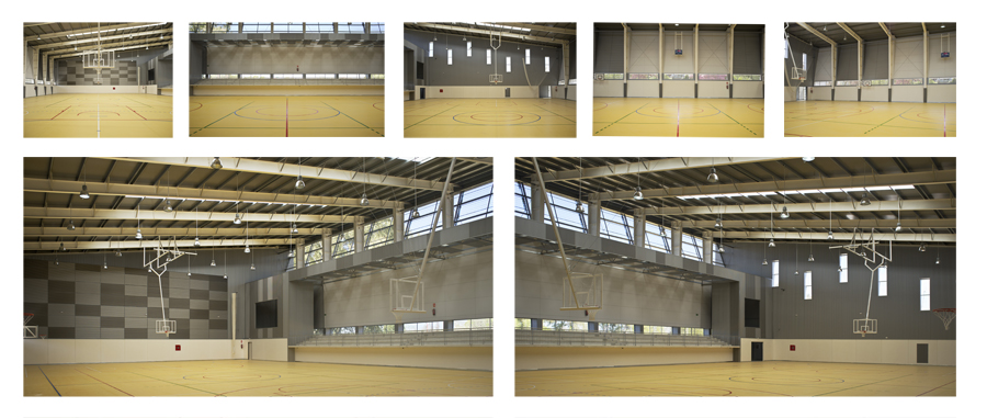 La sala polideportiva, que contiene la pista principal de 20 x 40 m y tres transversales para entrenamiento, las gradas, varios almacenes, un bar y zona de prensa destinada a retransmisiones deportivas. Por otro lado se ha proyectado un volumen anexo al pabellón, con aseos para el público, vestíbulo, zona de administración, vestuarios, almacén y volumen técnico.