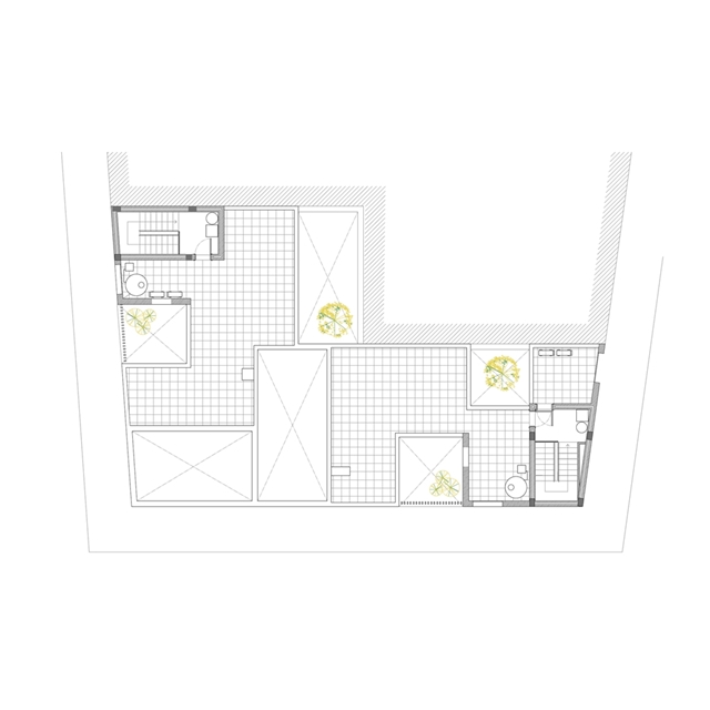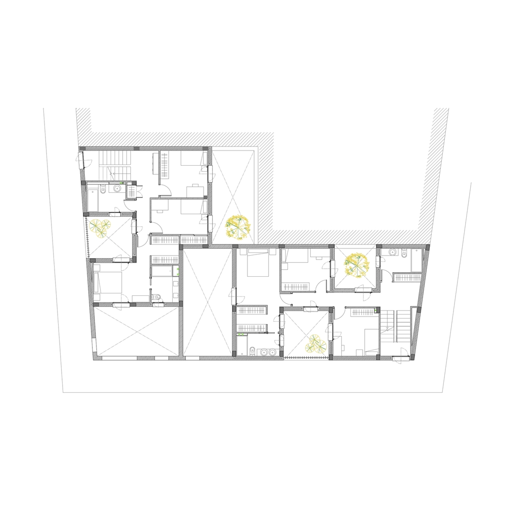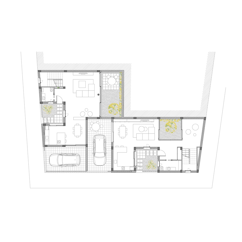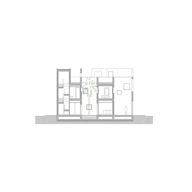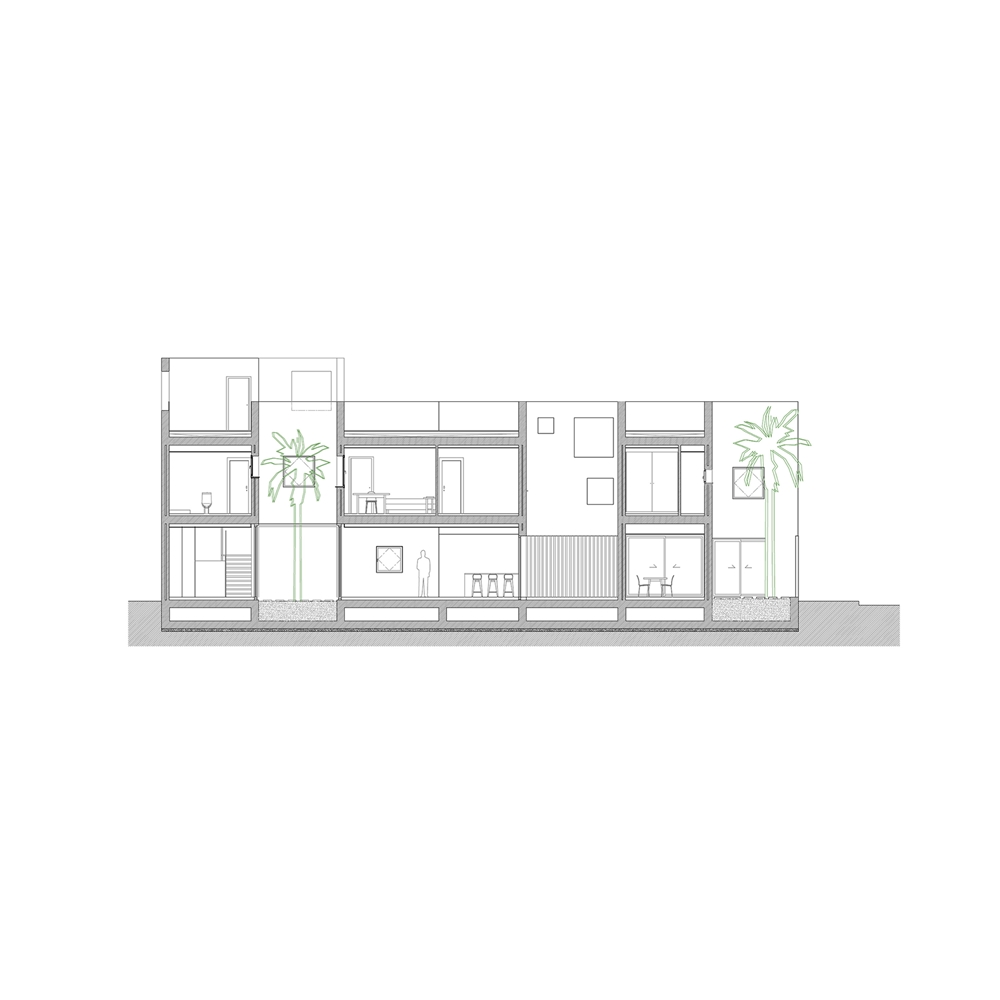 Las Casas Costacabana se organizan, por tanto, alrededor de patios interiores. Los usos más públicos —salones, cocinas y comedores— se disponen en el perímetro, actuando como una envolvente que protege la vida íntima de los patios del contacto directo con la calle. Estas franjas habitables funcionan como filtros: permiten una relación controlada con el entorno y, al mismo tiempo, dirigen la mirada y la vida hacia el interior. La arquitectura se convierte así en una herramienta de protección y de recogimiento, un refugio frente al contexto urbano inmediato.