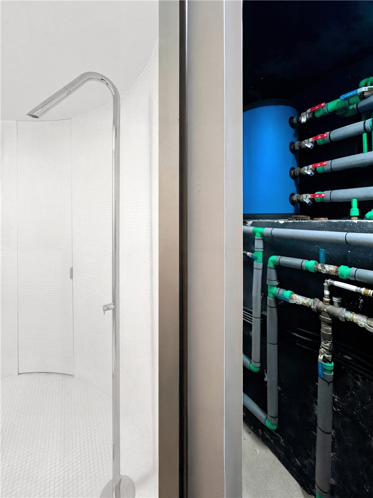 El perímetro y envolvente del espacio, además de un límite del aire y el agua, funciona como un contenedor. Así, dependiendo de las necesidades y morfología del espacio existente se formaliza como: un aislante, un contenedor de máquinas y conductos, armarios de material, o como usos anexos secundarios (sauna, baño, etc…). Los extremos del perímetro se curvan para favorecen los usos asociados, a la vez que generan espacios de oportunidad para contener las instalaciones de mayor envergadura. El material principal, un gres blanco hidrofugo, permite adaptarse a todos los planos y las formas curvas y sinuosas, multiplicando la entrada de luz cenital del lucernario. El color, los materiales, la forma y la luz hacen del espacio un lugar neutro, libre de uso, un espacio para la evasión.