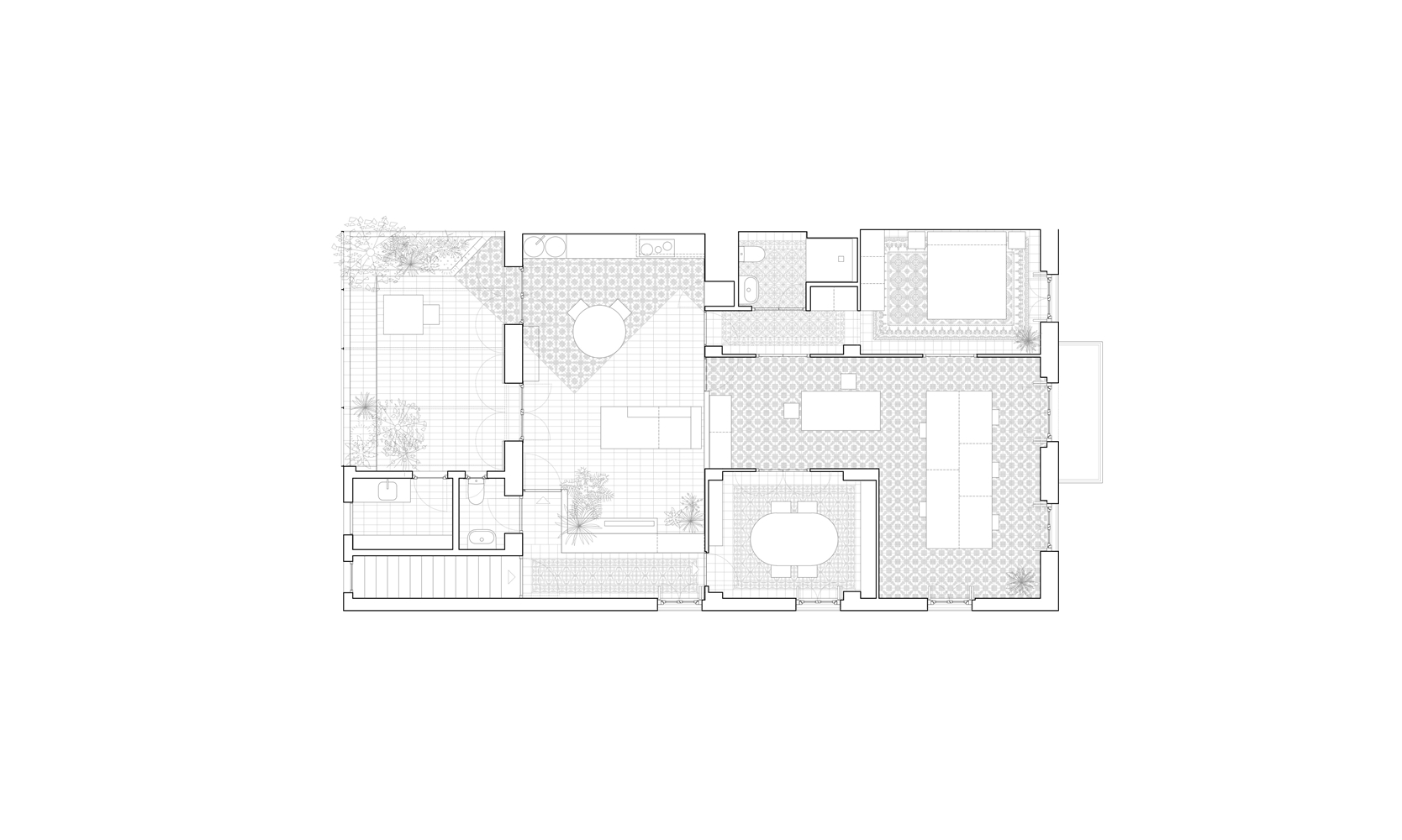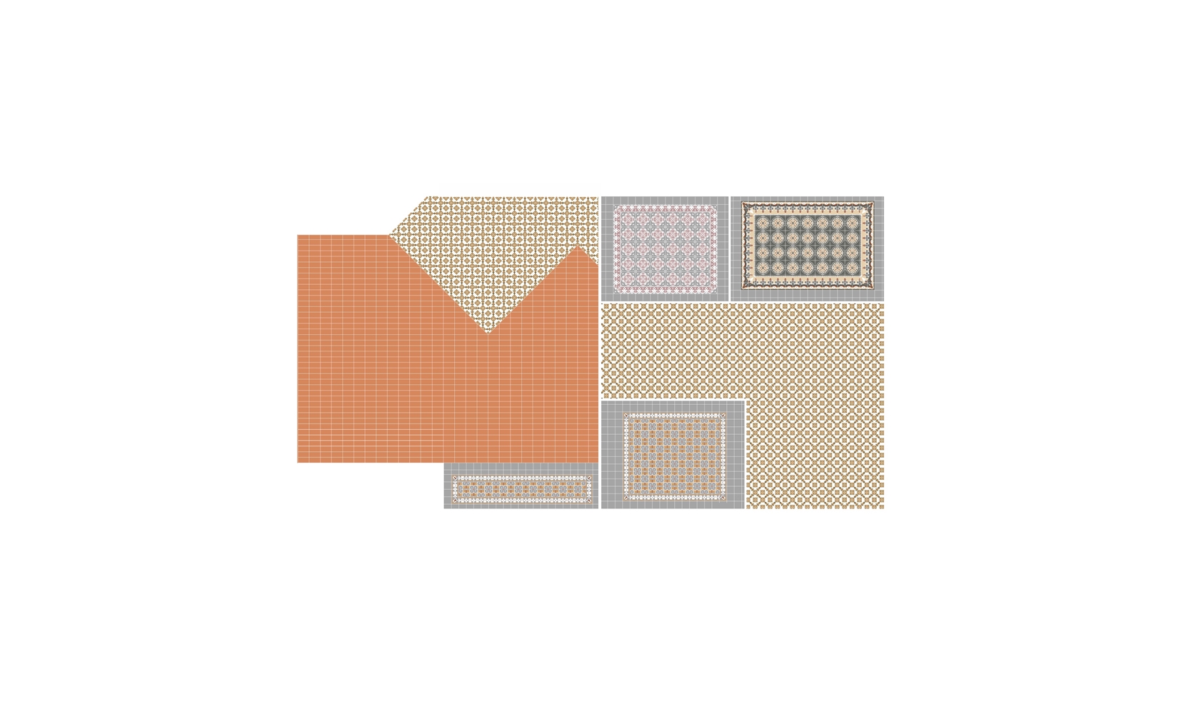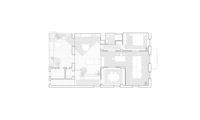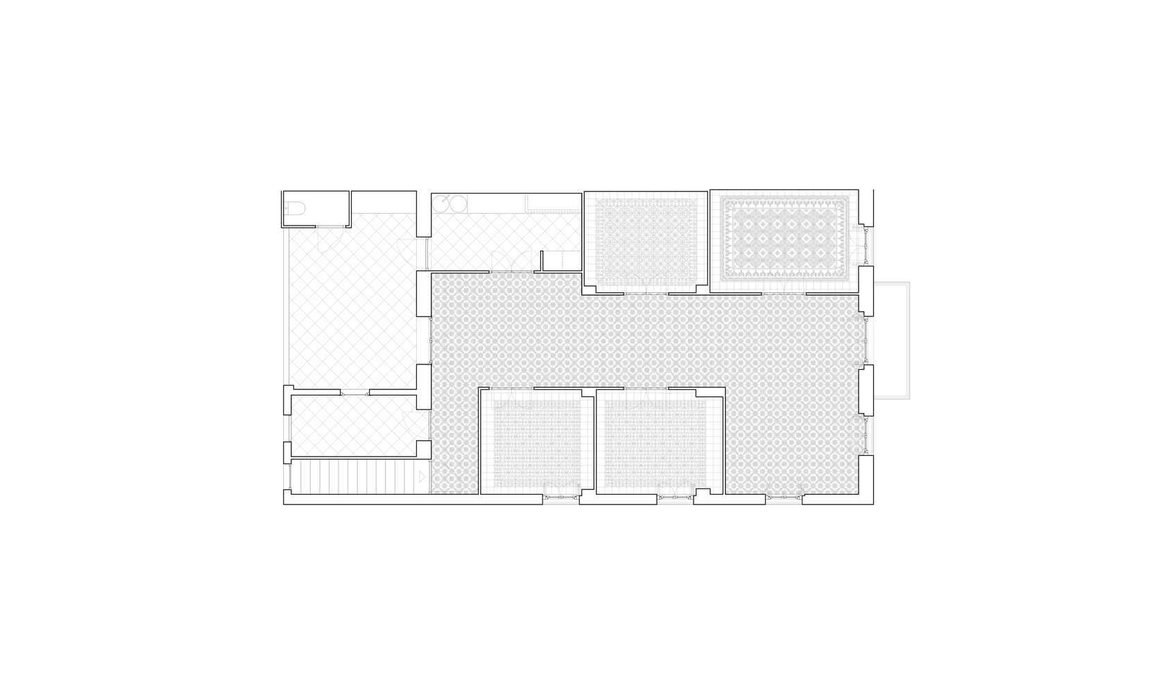 Los pavimentos se mantienen en su estado original en la zona de noche y estudio, pero la reconfiguración de la zona de día y la presencia en cocina y terrazas de pavimentos deteriorados fruto de anteriores intervenciones nos lleva a replantearlos aquí en su totalidad. En primer lugar, se retira cuidadosamente todo el pavimento original de baldosa hidráulica para su limpieza y clasificación, distinguiendo dos tipos: uno de ellos se reutiliza para crear una suerte de alfombra de acceso, mientras que el otro sustituye las piezas rotas en la zona de estudio y se recoloca en la zona de cocina. Su nueva disposición realiza un giro de 45º que lo distingue frente a los tramos que conservan su posición original y le permite extenderse bajo la mesa de comedor, definiendo también los recorridos hacia la terraza y zona de noche.
