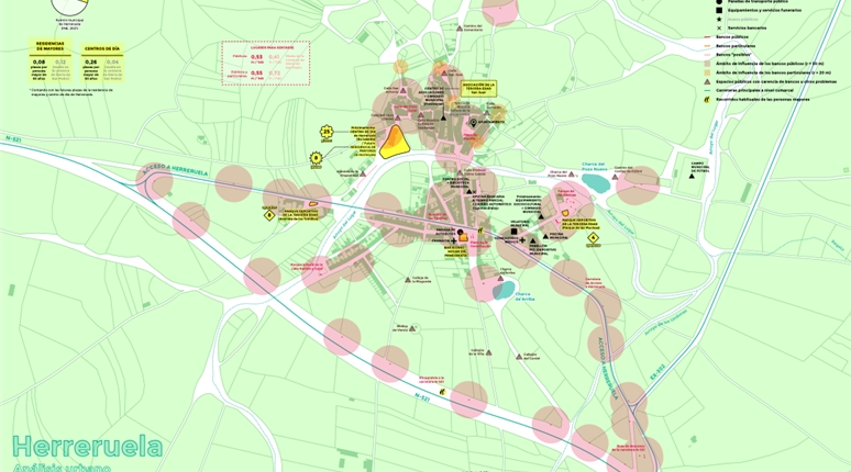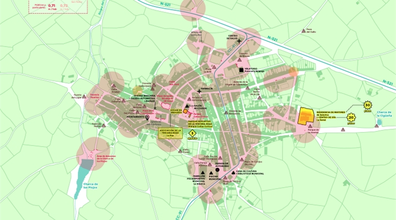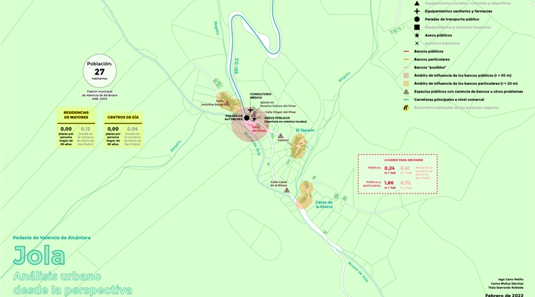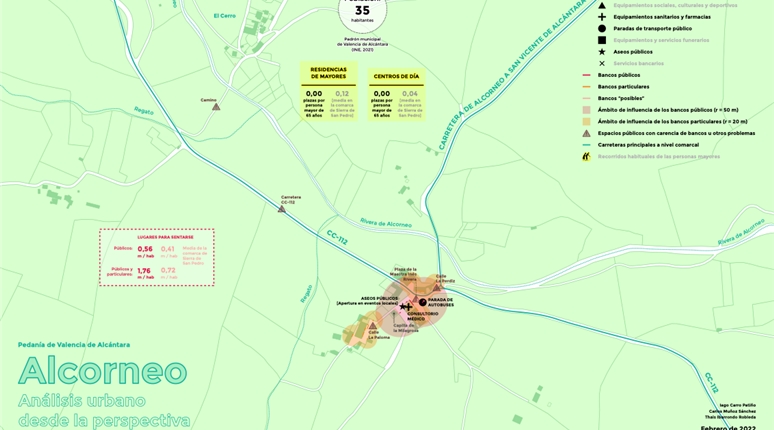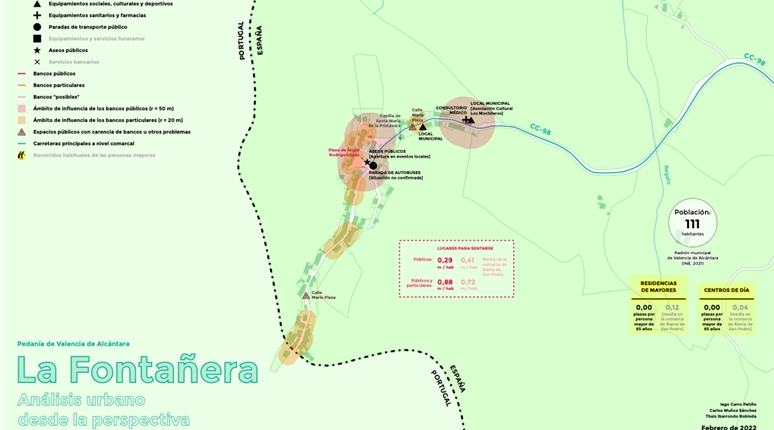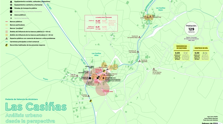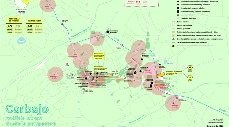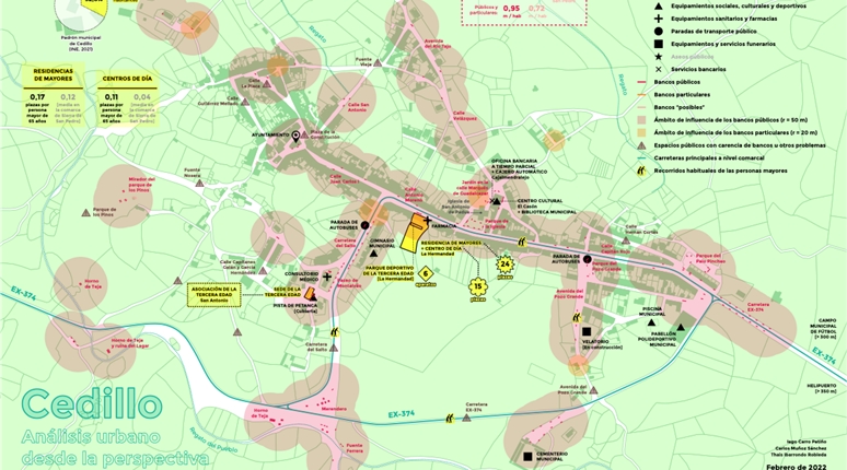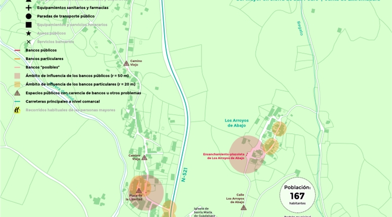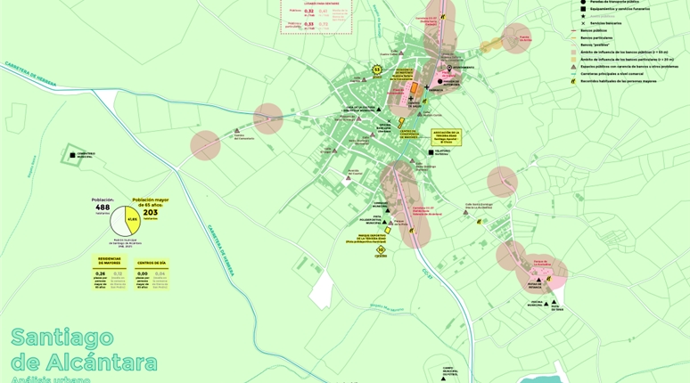 El proyecto se apoya en un análisis técnico detallado del espacio urbano y de los recorridos habituales de las personas mayores. Este análisis incluye el estudio sistemático de calles, plazas y espacios de estancia, con especial atención a los lugares para sentarse como elemento clave de accesibilidad y confort.