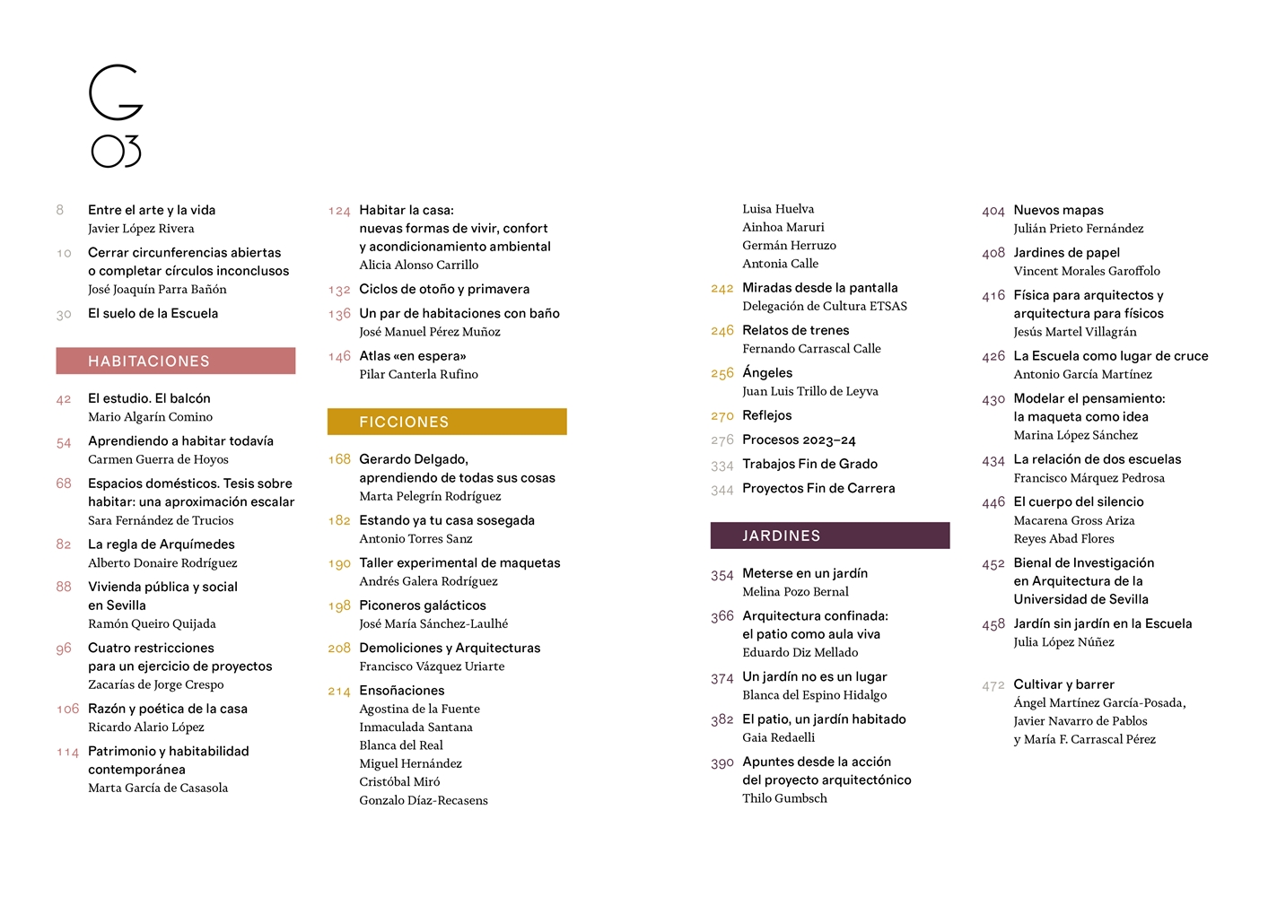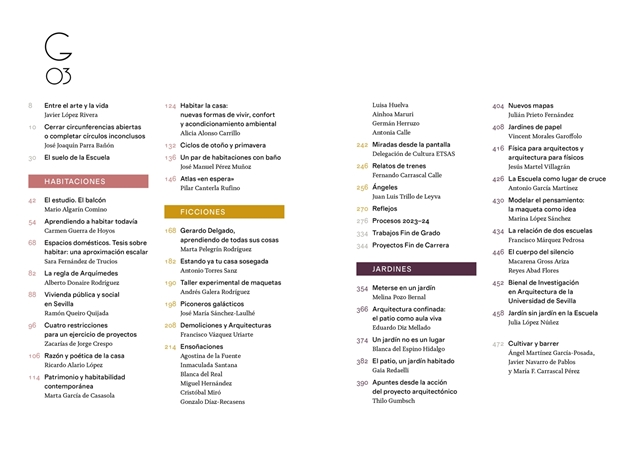 La tercera edición de Galerías se organiza en tres hilos narrativos: Habitaciones, Ficciones y Jardines. Tanto profesores como alumnos aportan en ellos exploraciones sobre la vivienda a través del aula; derivas hacia realidades insospechadas, acaso imposibles, o el recorrido por el jardín como espacio mitológico e instrumento bioclimático. Entre otras ensoñaciones, Galerías reúne relatos sobre pulidos de suelos, trenes y cuentos de Navidad, exploraciones sobre maquetas, panegíricos a compañeros que construyeron la escuela que vivimos, colecciones de casas, jardines de papel, papeles que contienen jardines, ejercicios de clase y exposiciones.