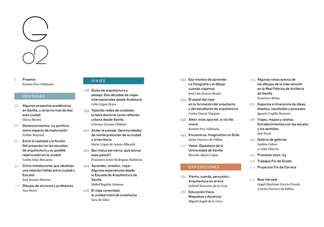 La segunda colección de Galerías, expansión de la narrativa escrita y gráfica de la Escuela de Arquitectura de Sevilla, se organiza en tres colecciones de historias del pasado y el presente de la Escuela: Ventanas, Viajes y Exposiciones. En ellas, entre profesores y alumnos, se van ensayando algunas fórmulas sobre la alquimia del aprendizaje en arquitectura: las relaciones entre la universidad y la ciudad; la experiencia de iniciativas en torno al desplazamiento educativo, y la metalingüística del despliegue de los trabajos en el aula. En un discurso coral, entre otras ventanas de contexto, Galerías reúne fiestas de la pedagogía del proyecto, odiseas iniciáticas de los maestros, exploraciones en los libros, unidades móviles de enseñanza, educación física de las maquetas, crónicas de cursos, contadores de historias, relatos de trayectos, dibujos de ciudades, galerías de galerías.