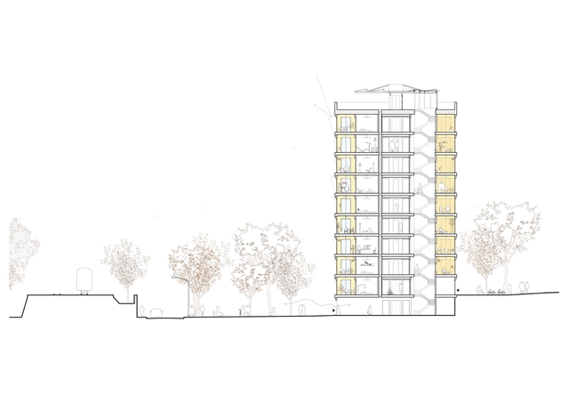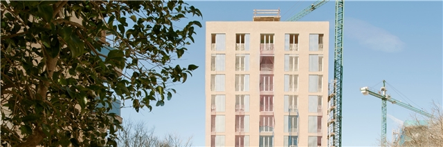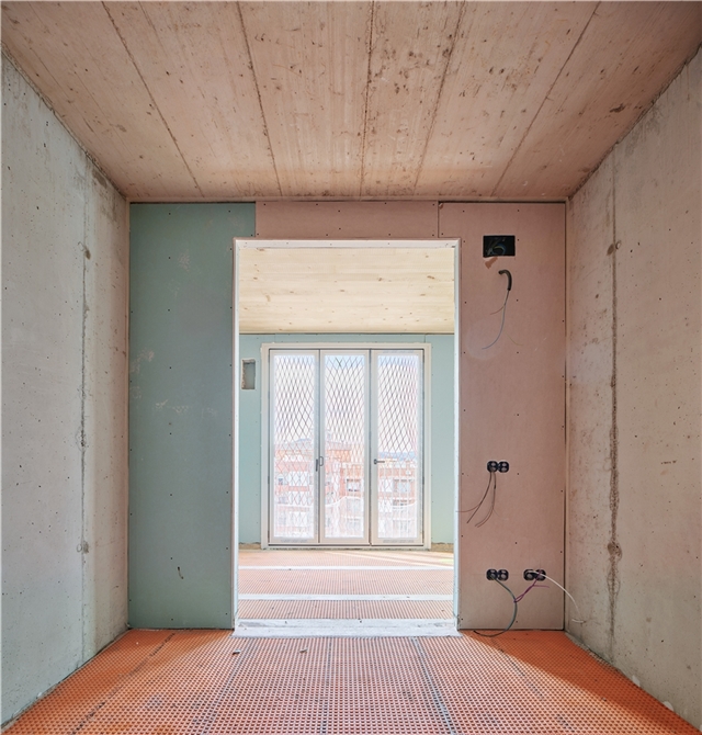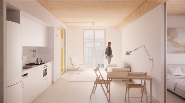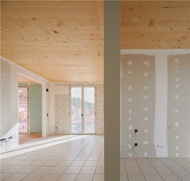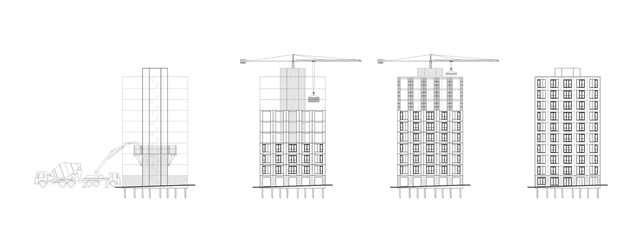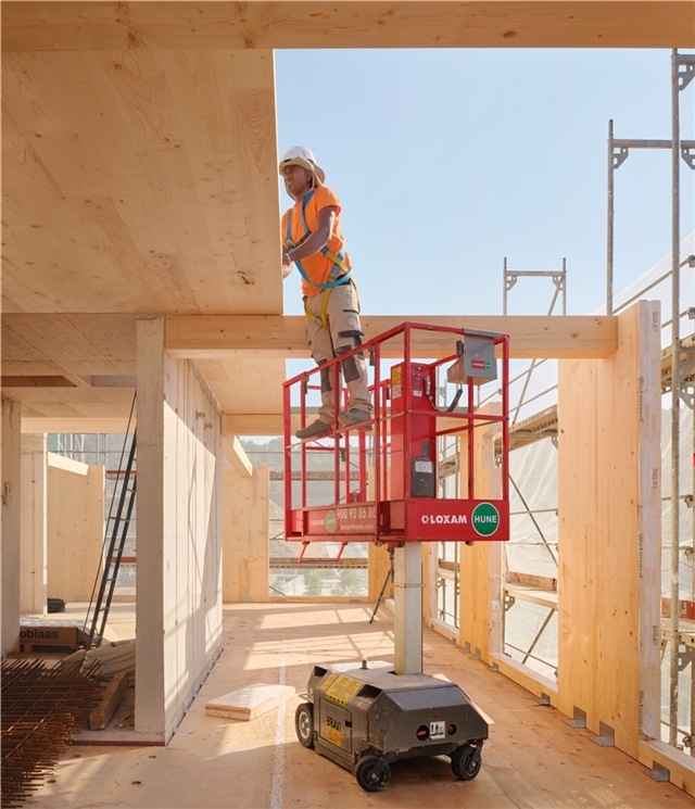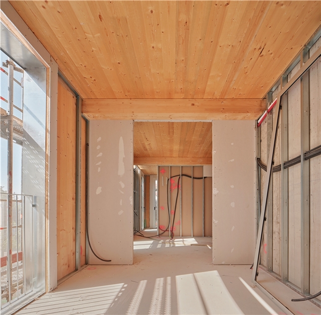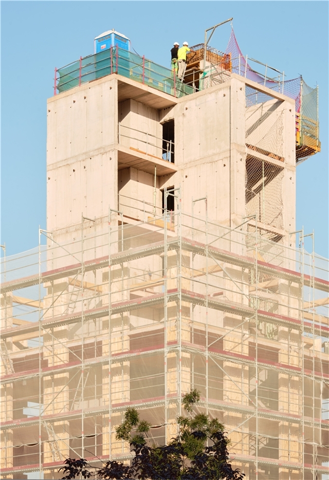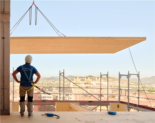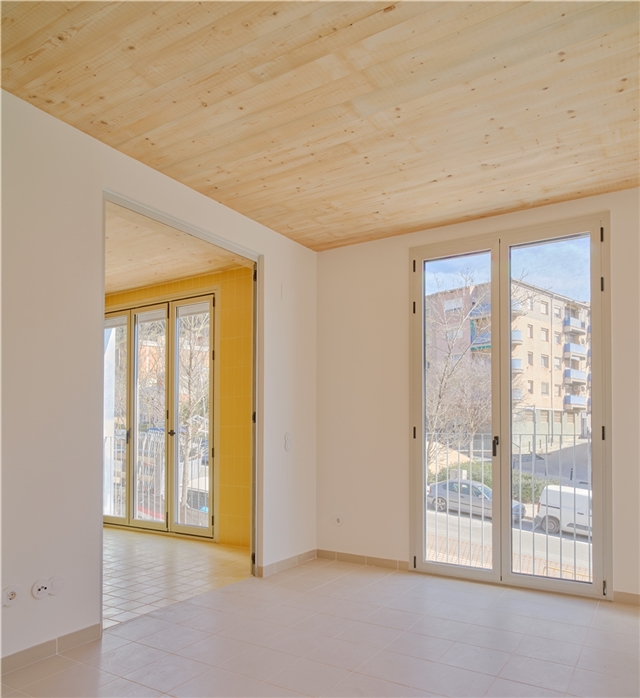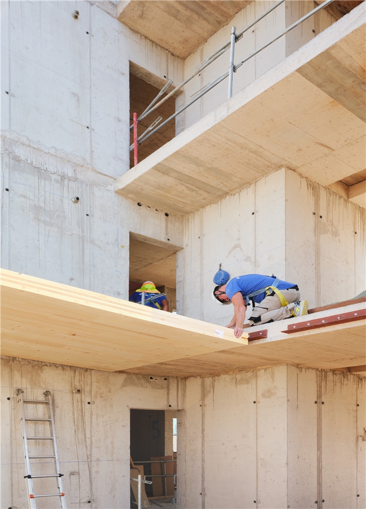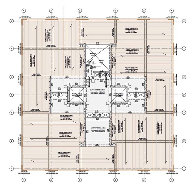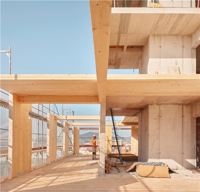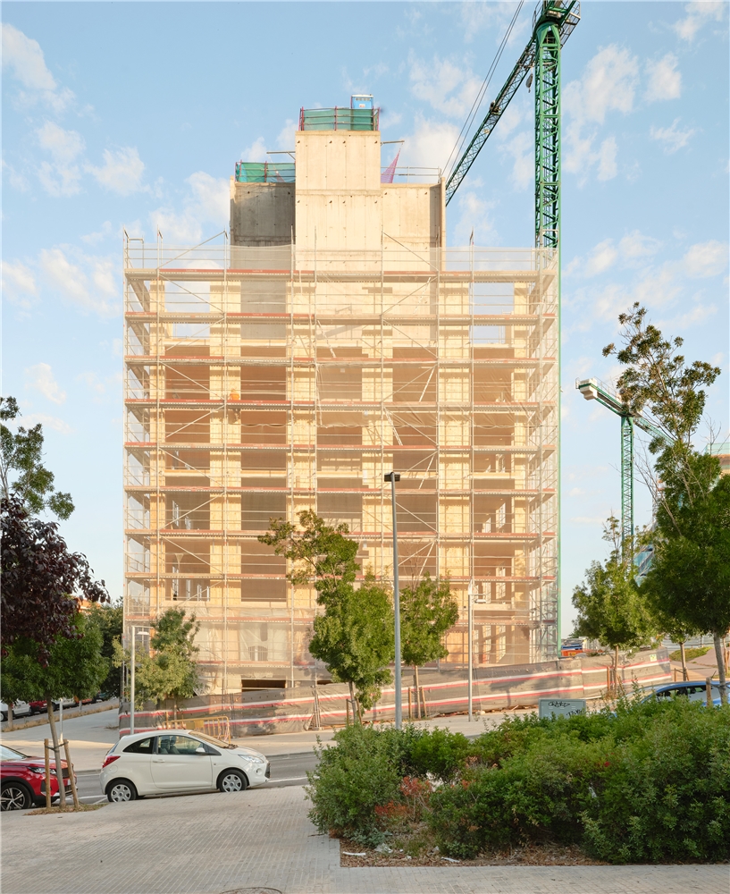 La estructura combina un núcleo central de hormigón armado ejecutado con encofrado trepante y una estructura perimetral ligera de madera. Los forjados y muros de paneles CLT independizan estructuralmente cada vivienda y mejoran el aislamiento acústico. Las tres últimas plantas se resuelven con entramado ligero de madera para reducir peso y optimizar costes.