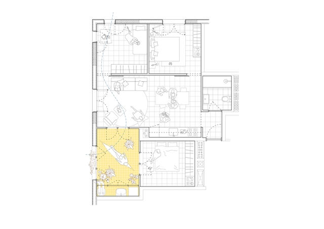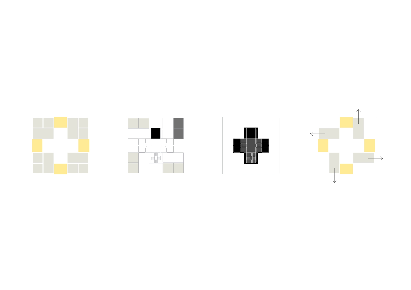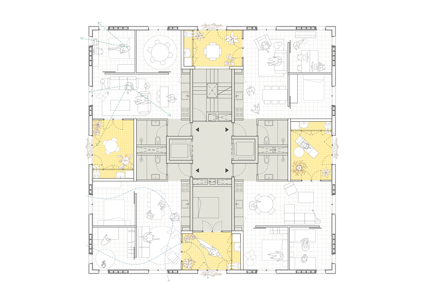 La distribución responde a una estrategia de desjerarquización: no existe habitación principal predeterminada, se eliminan pasillos y espacios residuales y toda la superficie es realmente habitable. La configuración en forma de esvástica garantiza orientaciones y vistas diferenciadas, favoreciendo la ventilación cruzada y la calidad ambiental.