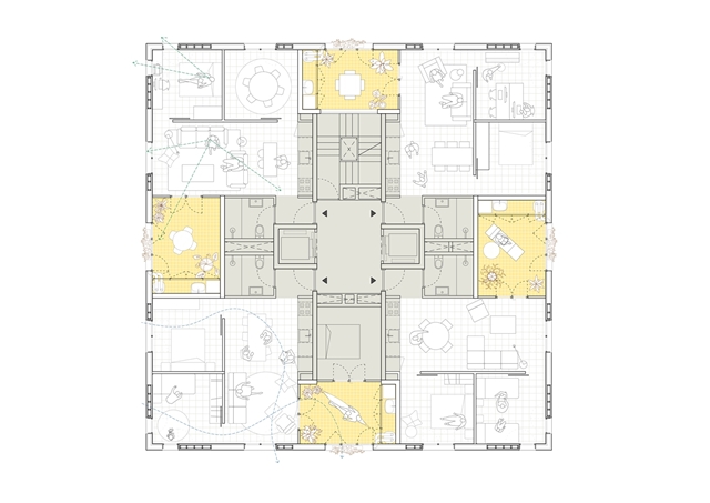 La planta, inscrita en un cuadrado de 18 x 18 metros, se organiza mediante una cruz central que articula cuatro viviendas por nivel.