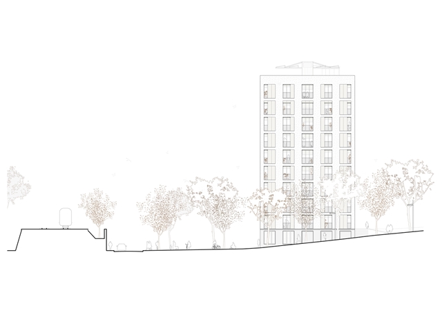La planta baja activa el espacio público mediante un local comercial y un aparcamiento de bicicletas abierto también al barrio. La urbanización perimetral se concibe como espacio verde de transición con especies autóctonas de bajo consumo hídrico.