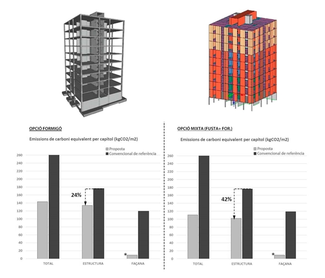 Un estudio comparativo de emisiones de CO₂ frente a un edificio convencional demostró que la estructura mixta madera–hormigón reduce el impacto ambiental en más de un 40% en kg de CO₂ por m² construido.