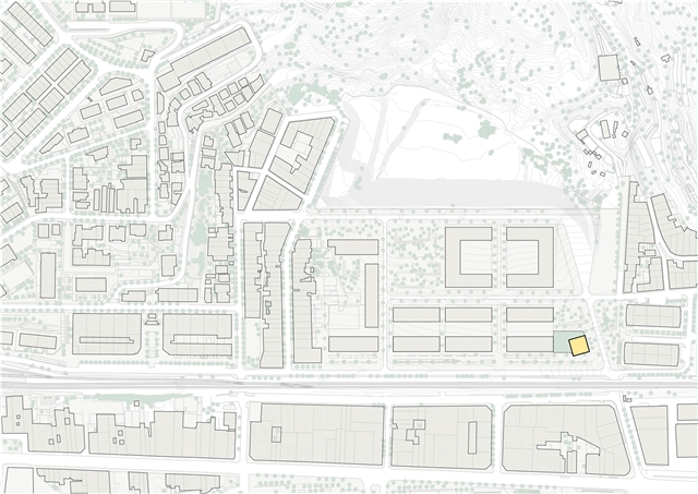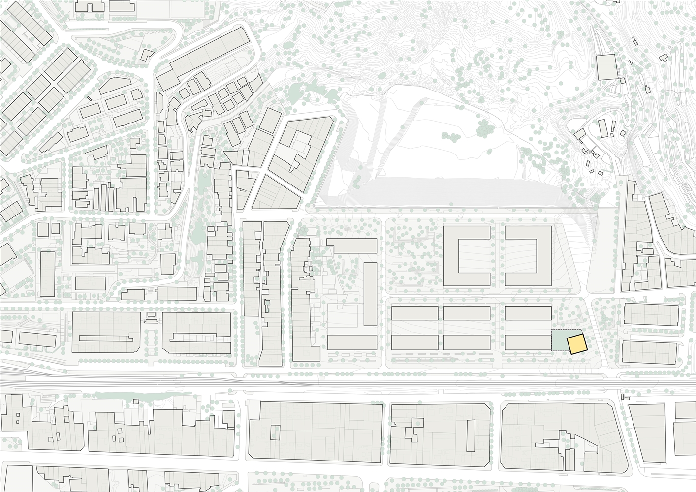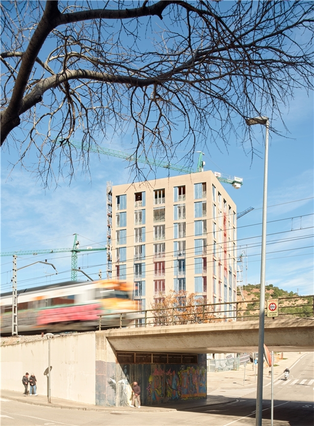 La torre se sitúa en un ámbito de desarrollo urbano al pie de la Sierra de Collserola y frente a la línea ferroviaria. Se implanta sobre una topografía en pendiente y se gira ligeramente respecto a las edificaciones colindantes, reforzando su singularidad y su condición de hito.