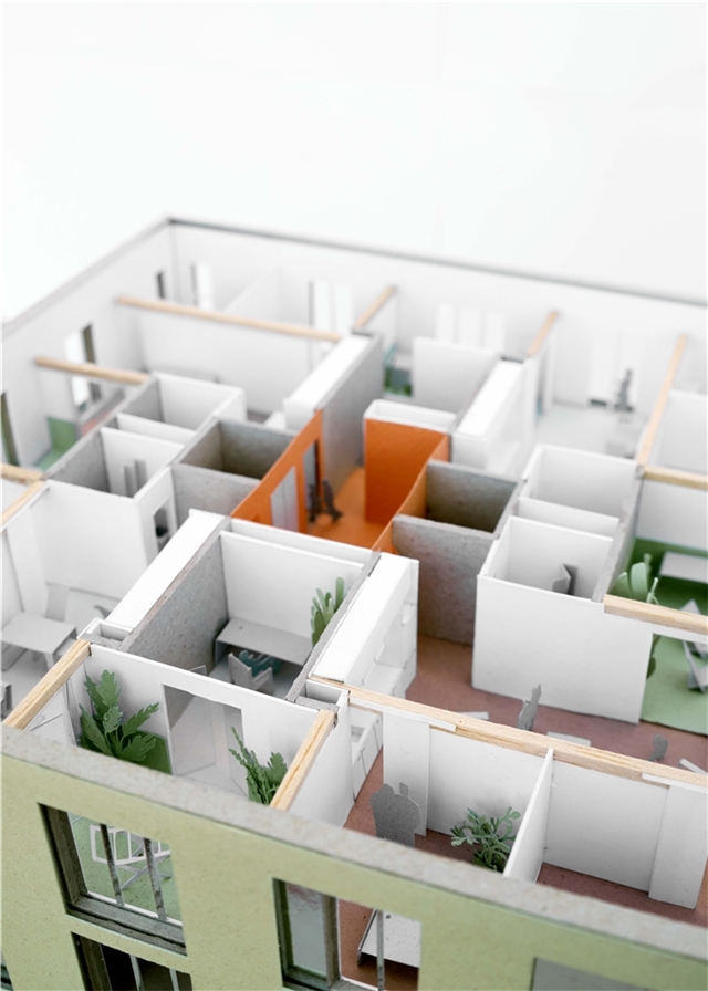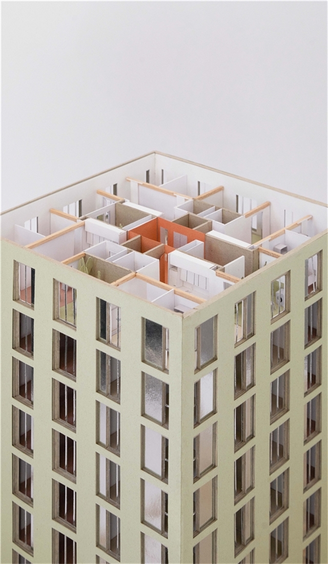 La exigencia de combinar viviendas de dos y tres dormitorios se resuelve mediante la posición asimétrica del núcleo de comunicaciones dentro de la cruz central. La escalera desplazada genera una geometría variable que, junto con la disposición estratégica de las galerías, permite incorporar una tercera habitación en una vivienda por planta, garantizando iluminación y ventilación natural.