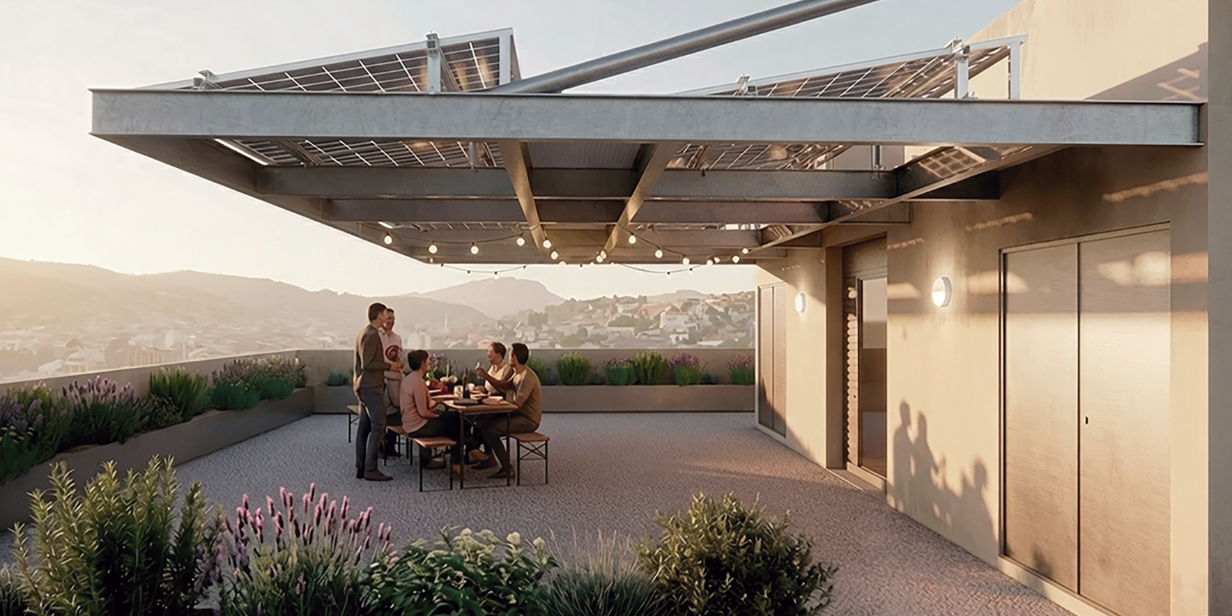 - Lavandería comunitaria en cubierta vinculada a una gran terraza común protegida por una pérgola fotovoltaica.