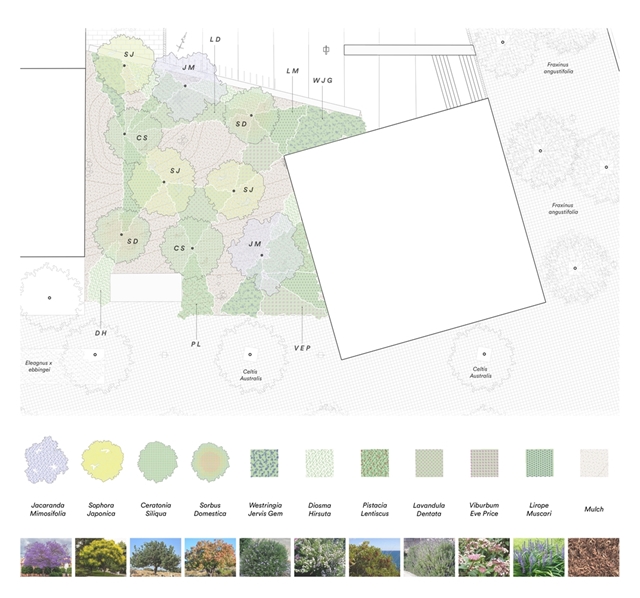 Las áreas libres se ajardinan con especies autóctonas de bajo consumo hídrico. En cubierta, la terraza comunitaria bajo la pérgola fotovoltaica se acompaña de jardineras perimetrales con vegetación arbustiva, fomentando la biodiversidad en altura.