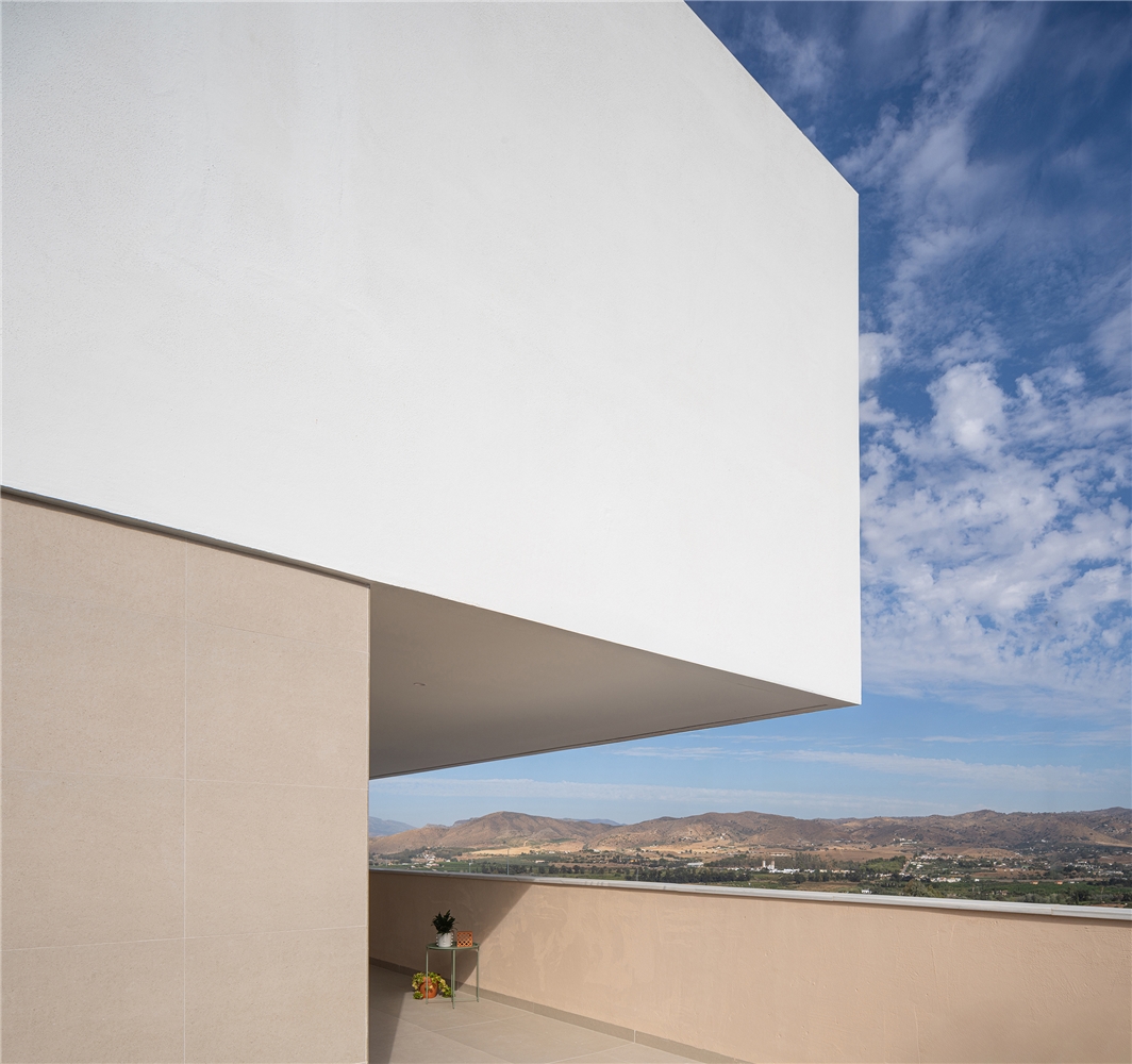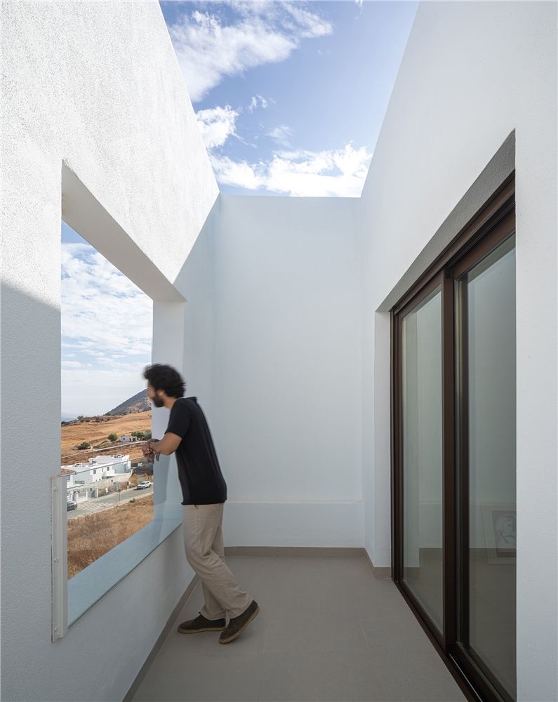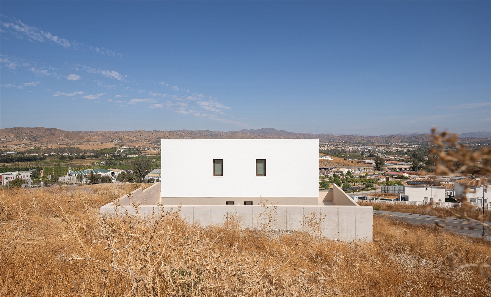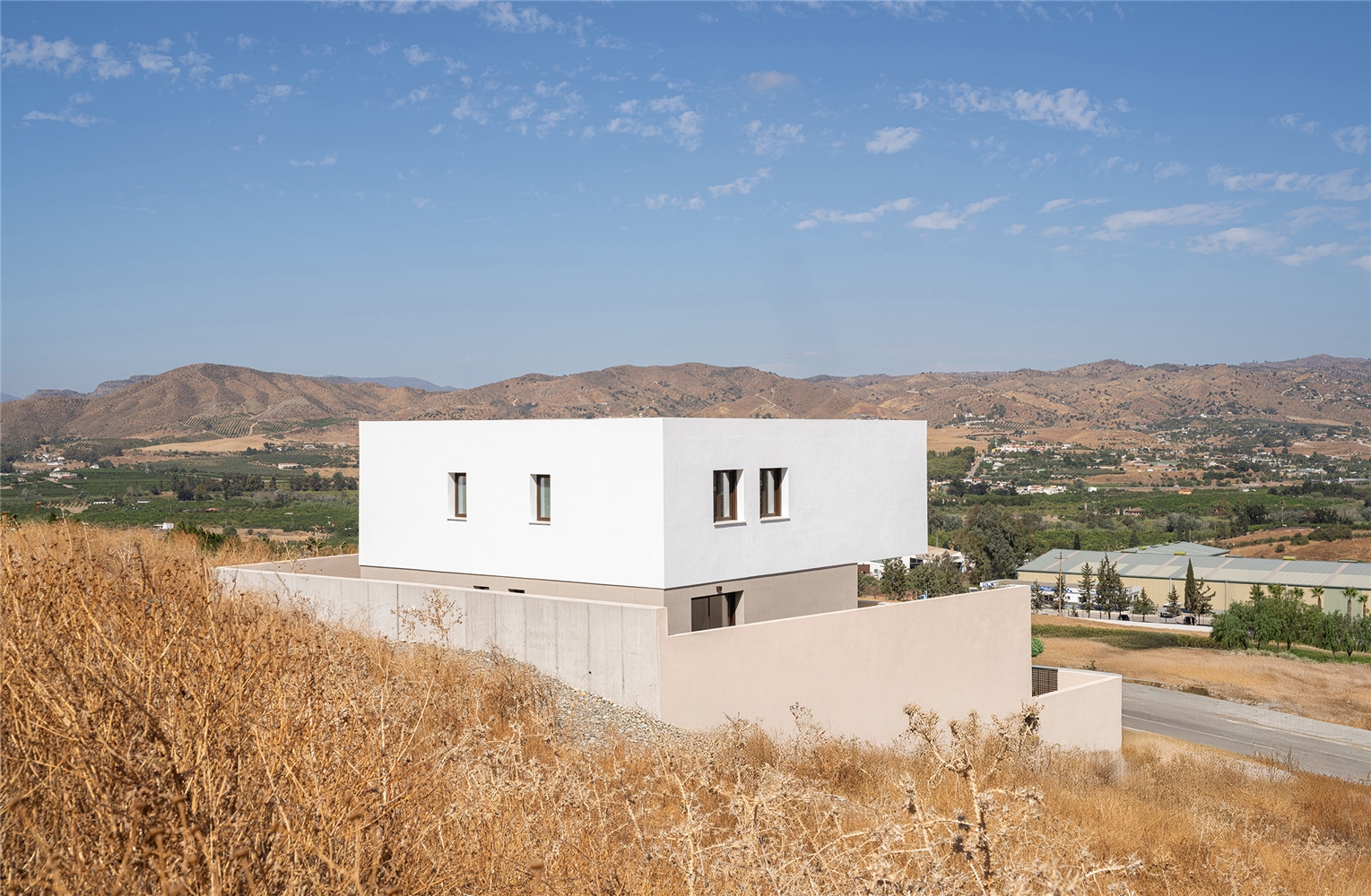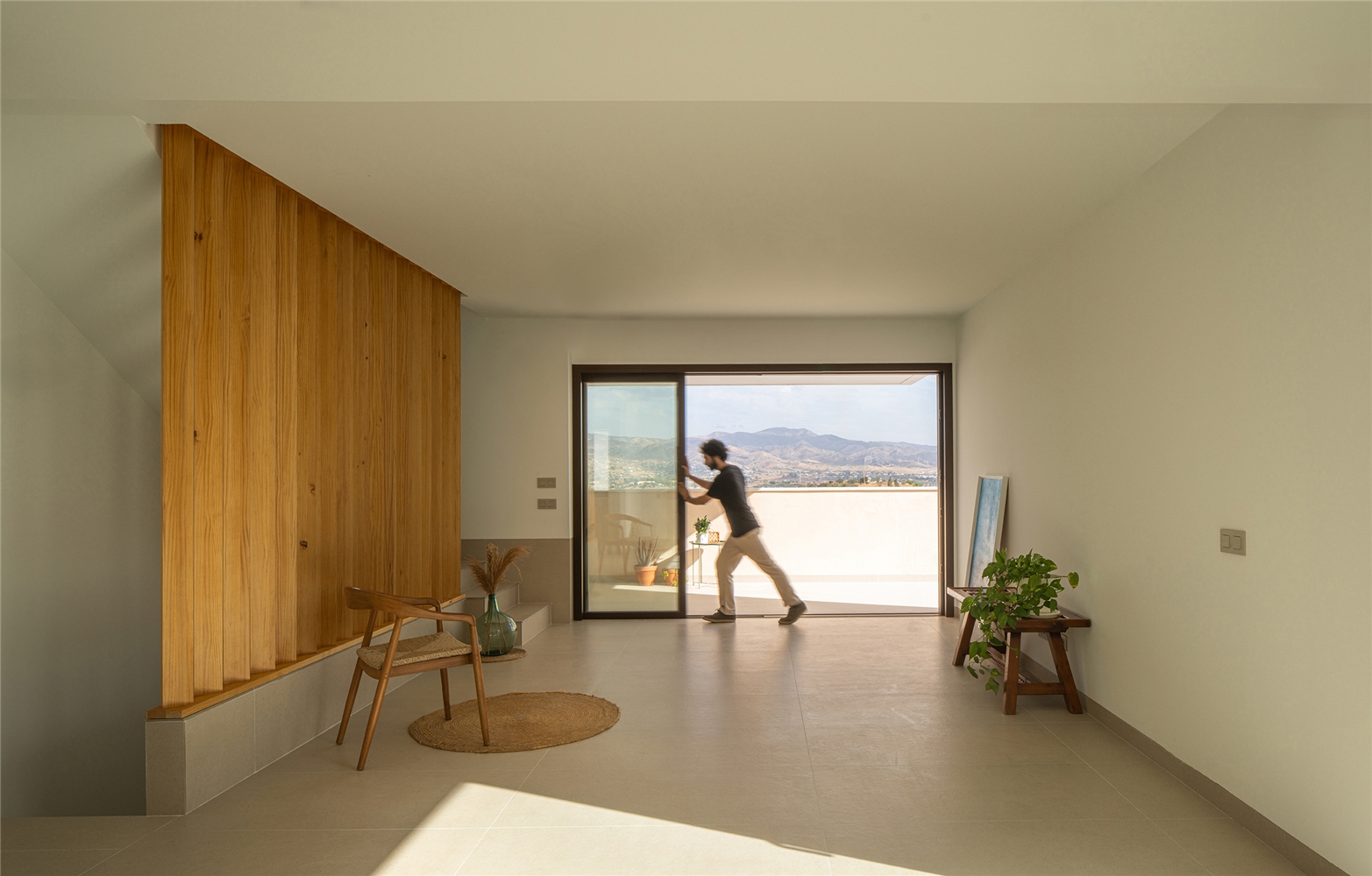 Esa mirada elevada convierte la vivienda en una especie de acrópolis doméstica. Desde lo alto, los habitantes establecen una relación con su territorio que no es agresiva ni defensiva, sino contemplativa. La casa observa el paisaje como aquel que se asoma discretamente por la mirilla de su puerta al escuchar un ruido en el portal: con curiosidad, pero también con prudencia; con deseo de entender lo que ocurre fuera, pero preservando la intimidad de lo que sucede dentro. Ese juego constante entre protección y apertura define el carácter del proyecto.