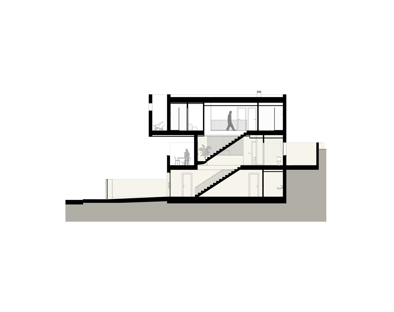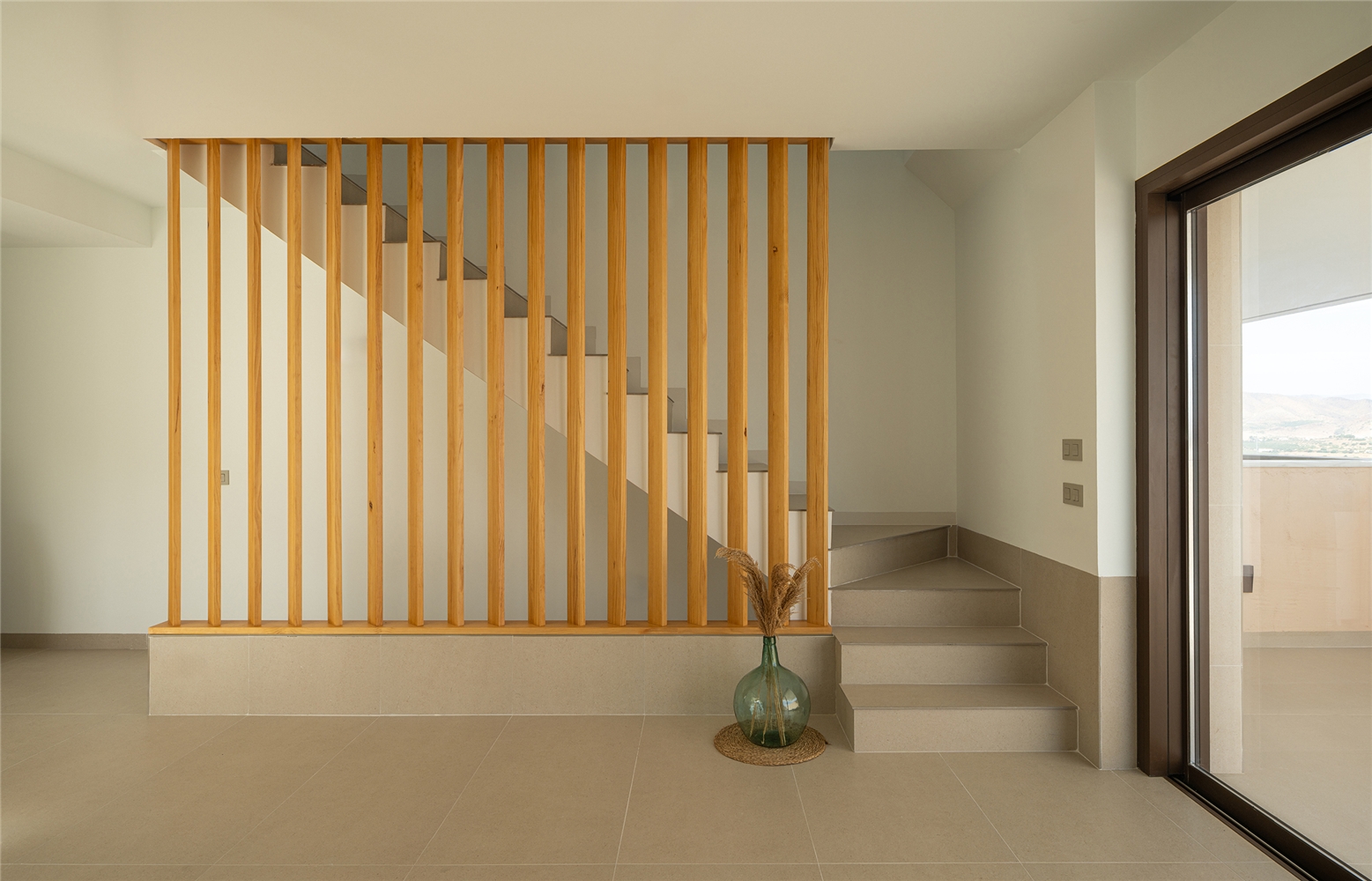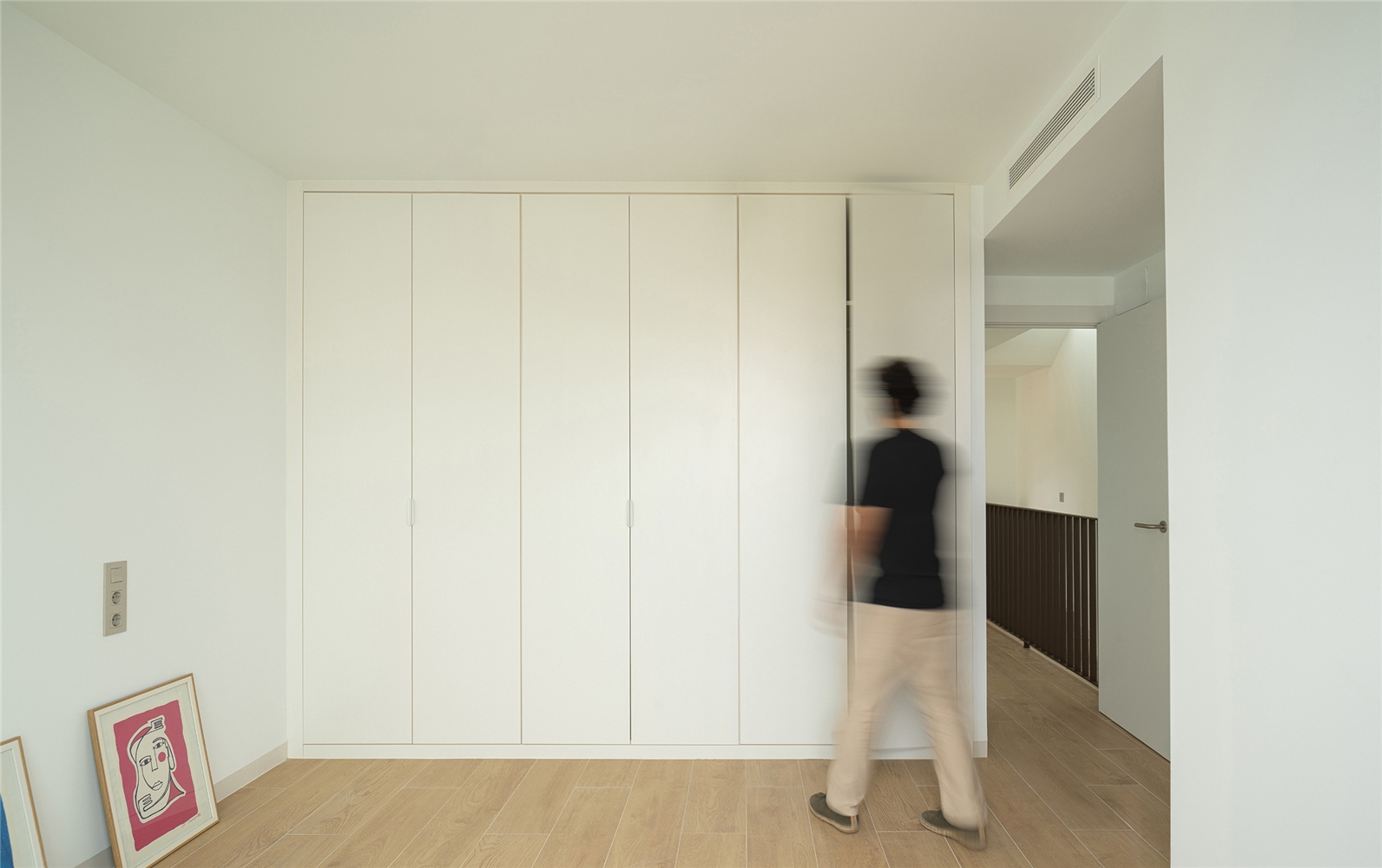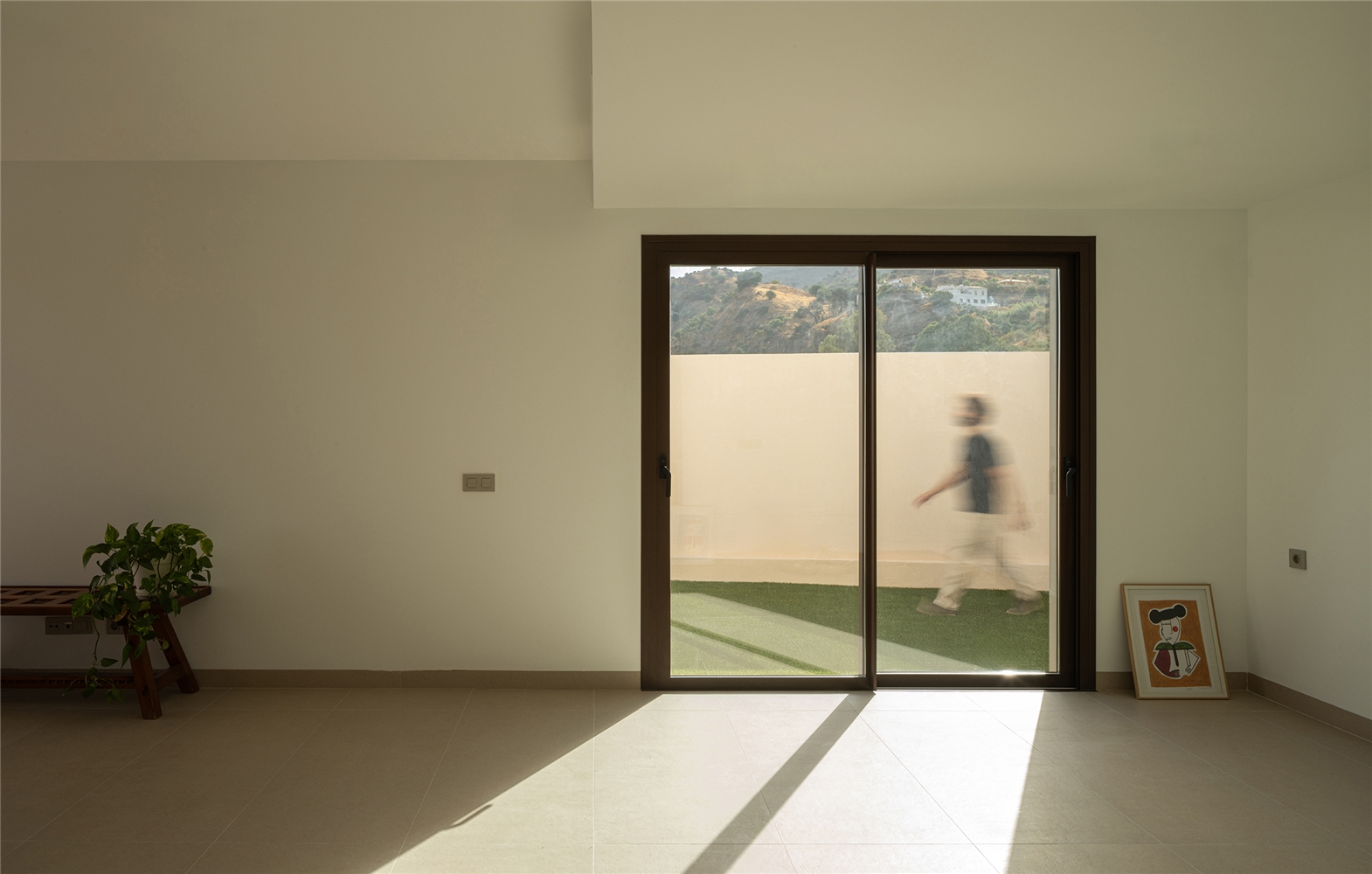 Sobre ese basamento emerge un plano horizontal donde se asienta la vida cotidiana. Es una plataforma que organiza el habitar, un suelo continuo que ordena el día a día de forma silenciosa y generosa. La domesticidad se despliega así en un espacio que combina refugio y apertura, densidad y ligereza. Cada estancia se orienta de forma estratégica, garantizando que la relación entre interior y exterior nunca sea directa o impuesta, sino filtrada y medida.