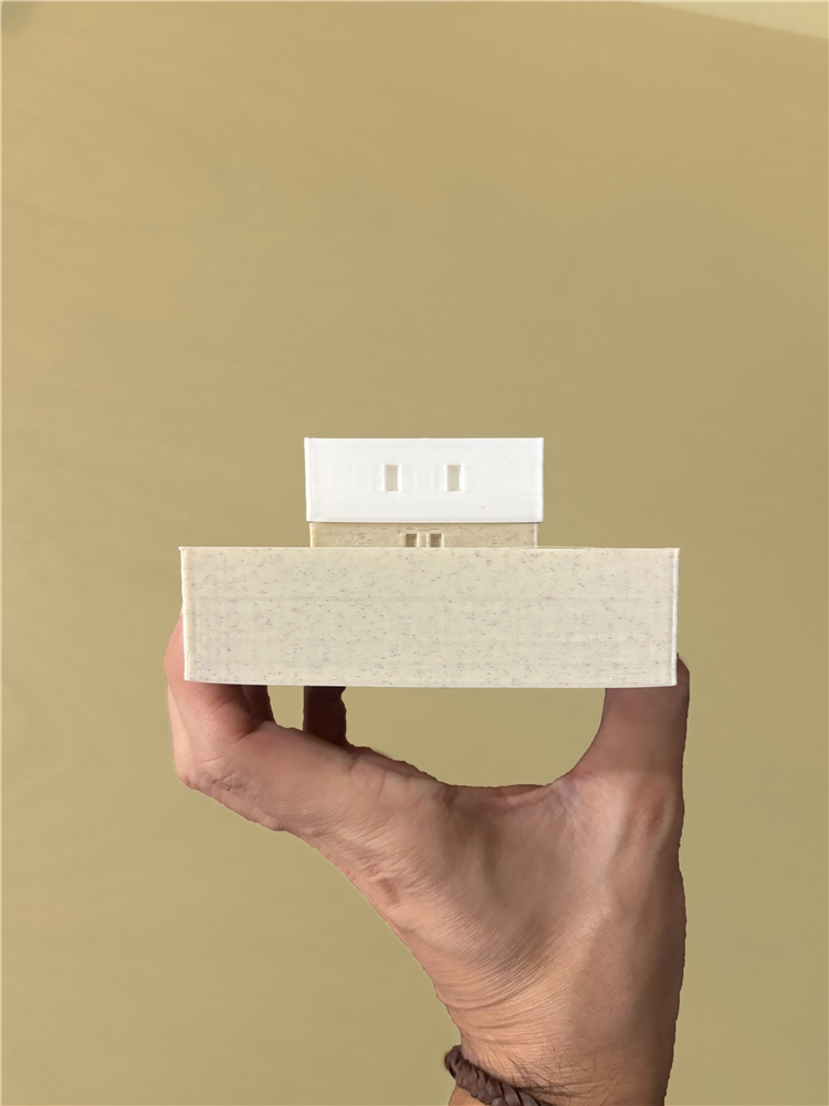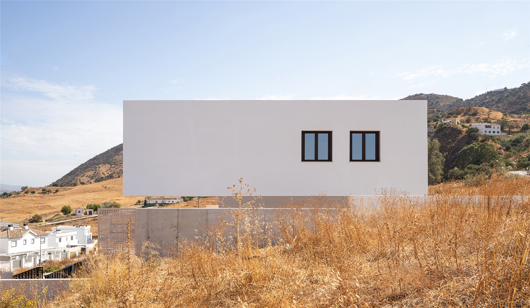 La pieza superior, pura y perforada, se apoya sobre un basamento que nace de la tierra y crece de forma orgánica, casi como una protuberancia geológica que hubiera estado siempre allí. Este zócalo no es solo una estructura de soporte, sino un gesto que arraiga la vivienda al terreno, que la ancla antes de permitirle levantarse. Su geometría natural contrasta con la nítida abstracción del volumen blanco, generando un diálogo entre lo mineral y lo construido, entre la naturaleza y la arquitectura.