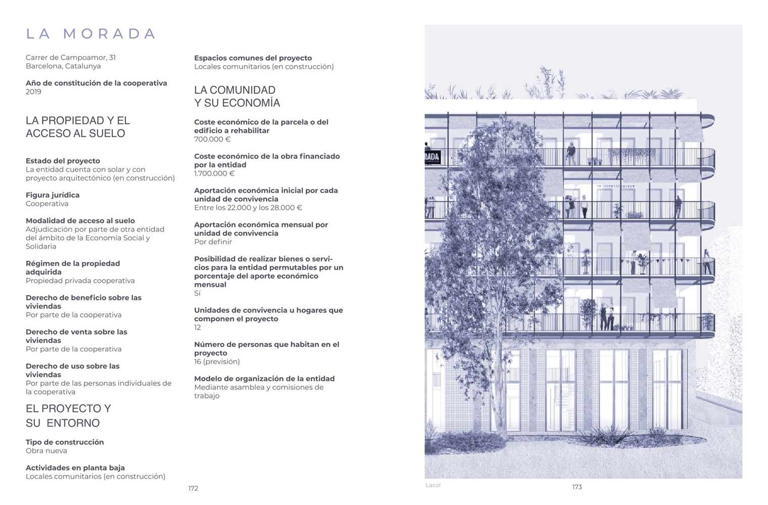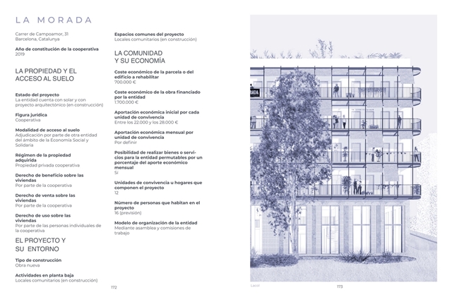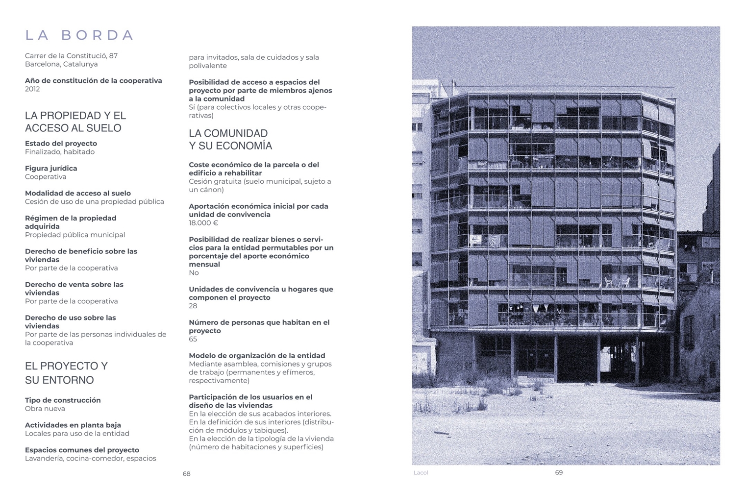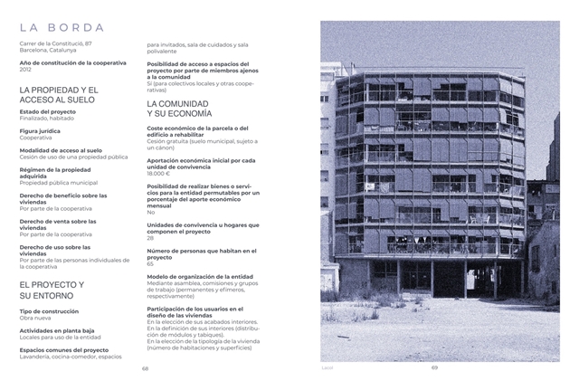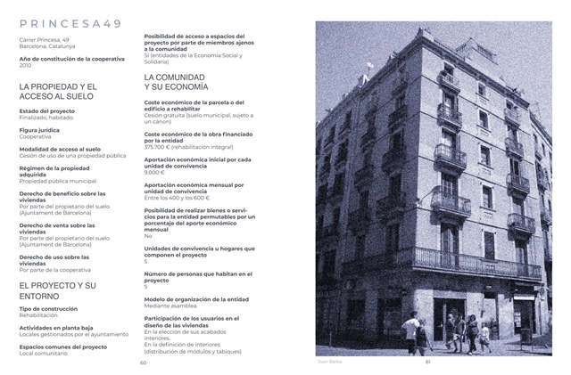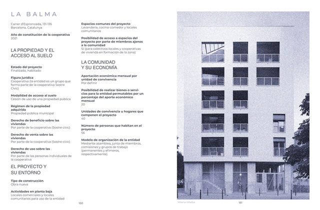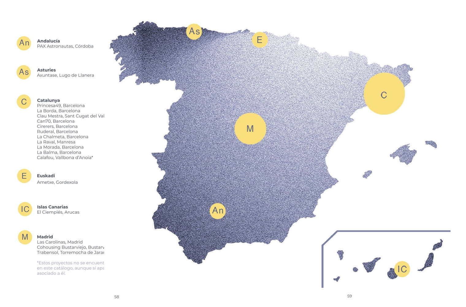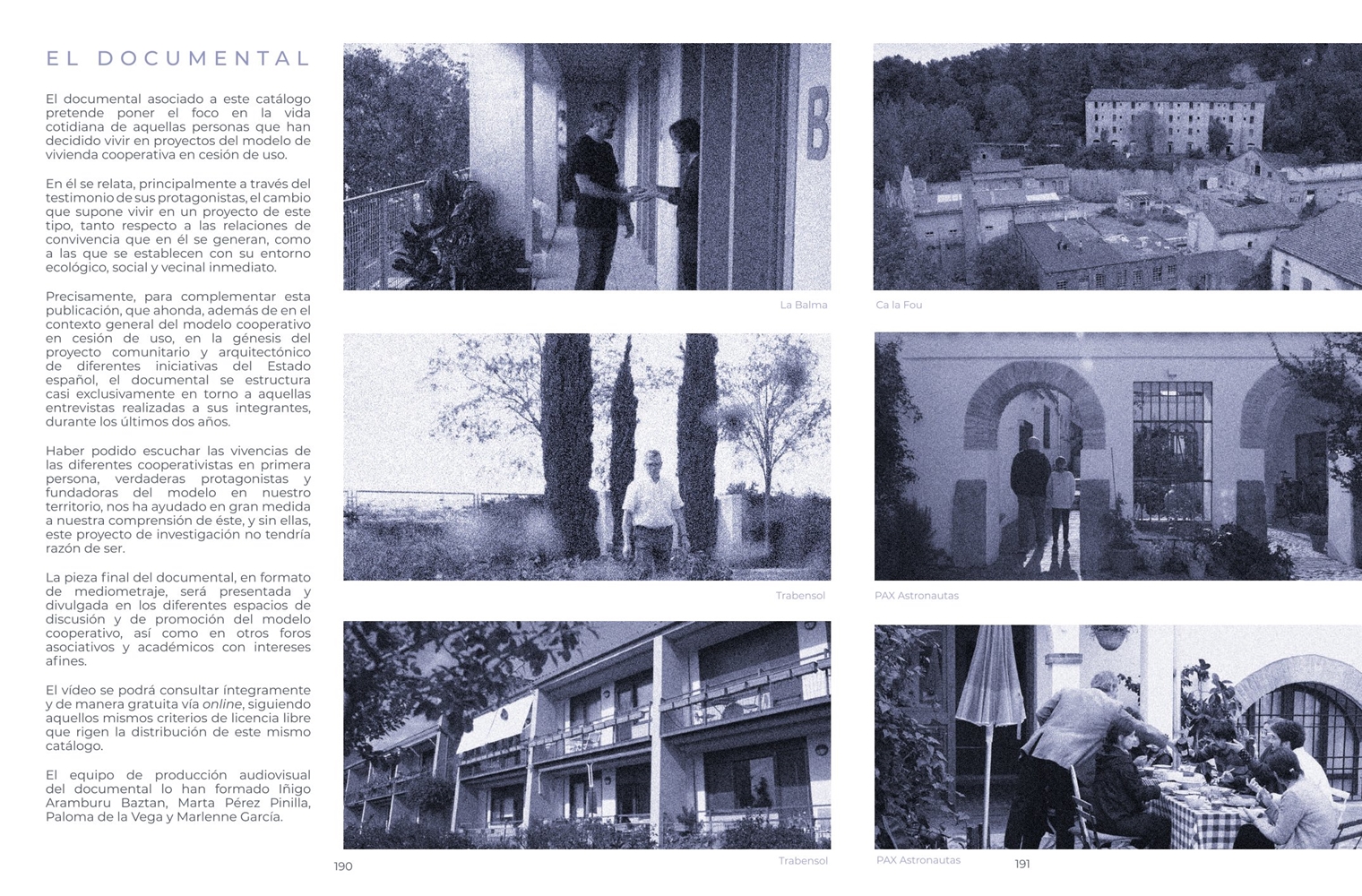 El trabajo de campo combinó visitas, entrevistas semiestructuradas, documentación arquitectónica y registros audiovisuales. Se priorizaron experiencias consolidadas o en fases avanzadas de construcción para ofrecer ejemplos replicables. Entre los proyectos documentados figuran Princesa49, La Borda, Clau Mestra, Can70, Entrepatios Las Carolinas, Cirerers, Ruderal, Ametxe, PAX Astronautas, La Chalmeta, Axuntase, La Raval, Cohousing Bustarviejo, El Ciempiés, La Morada, La Balma, Trabensol y Cala Fou.