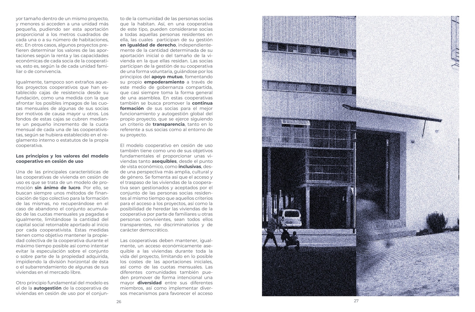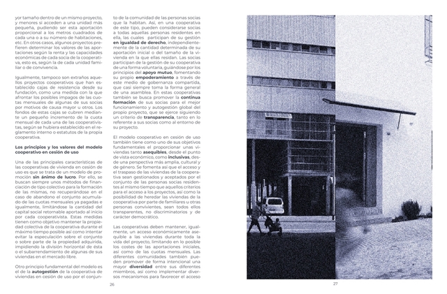 La cesión de uso plantea una alternativa frente a la mercantilización de la vivienda: la titularidad del suelo y del inmueble reside en la cooperativa, mientras las personas socias tienen derechos de uso sin posibilidad de venta individual. Esta configuración responde a la concepción de la vivienda como bien de primera necesidad y su arquitectura trata de generar espacios de encuentro y convivencia comunitarios. A partir de este núcleo, la investigación explora las implicaciones sobre propiedad, promoción, tipologías y diseño arquitectónico, mecanismos de financiación y formas de gobernanza y participación.