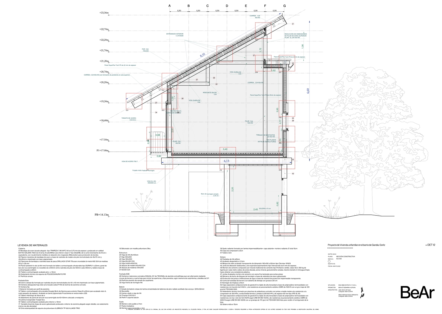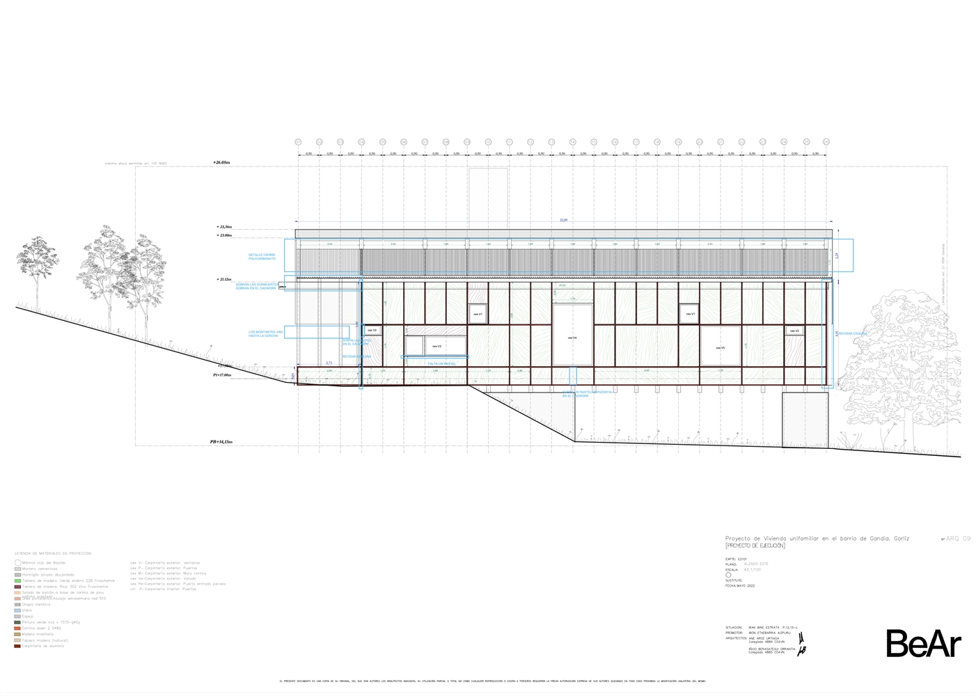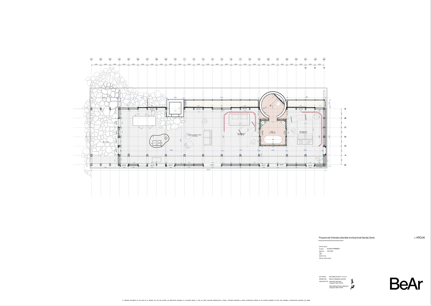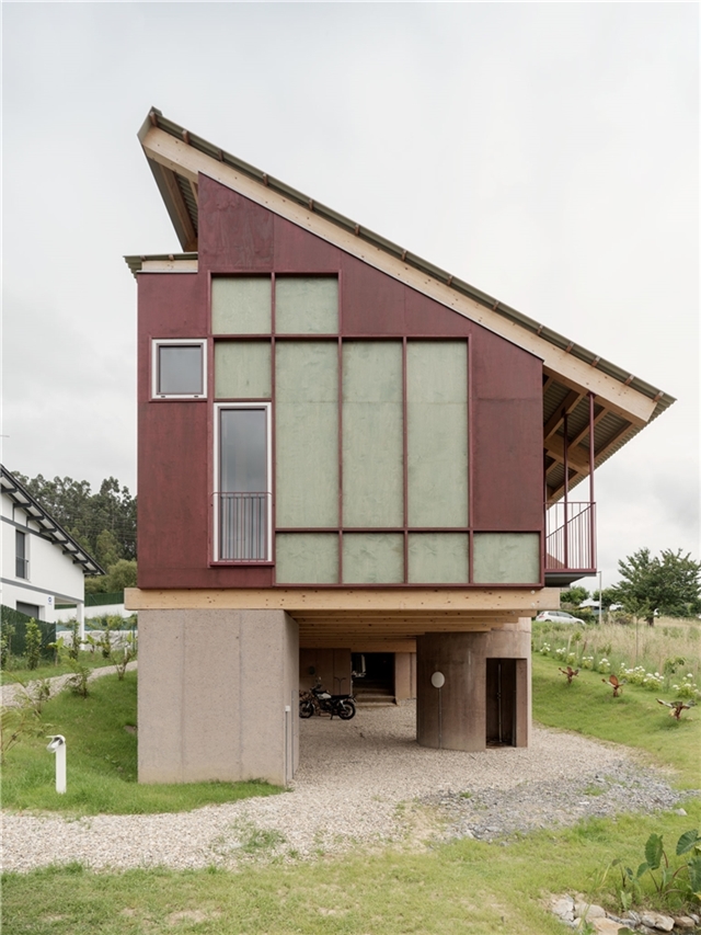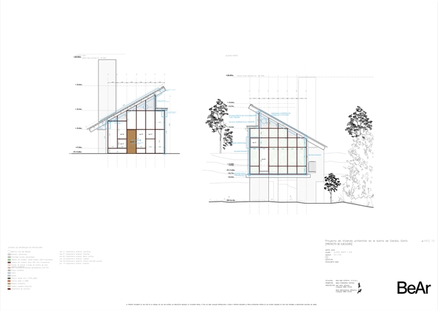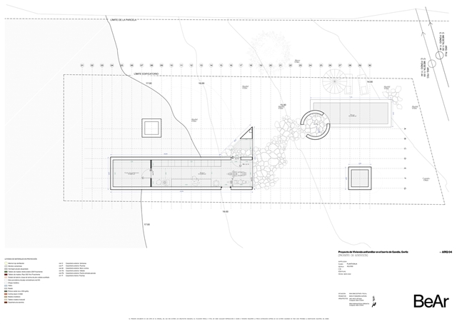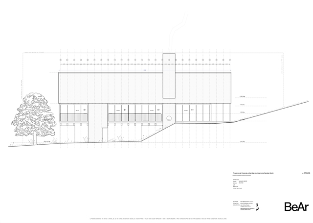 En un barrio residencial de parcelas enrejadas y cuyo mayor valor es todavía no estar ocupado, se ubica esta vivienda que busca en sus condiciones topográficas sus respuestas de proyecto. Estrecha y larga, ni excavada, ni sobre plintos de escombro, la vivienda se posa buscando levitar, manteniendo bajo ella la pronunciada pendiente natural del terreno y colocando minuciosamente sus apoyos, buscando el estrato rocoso.