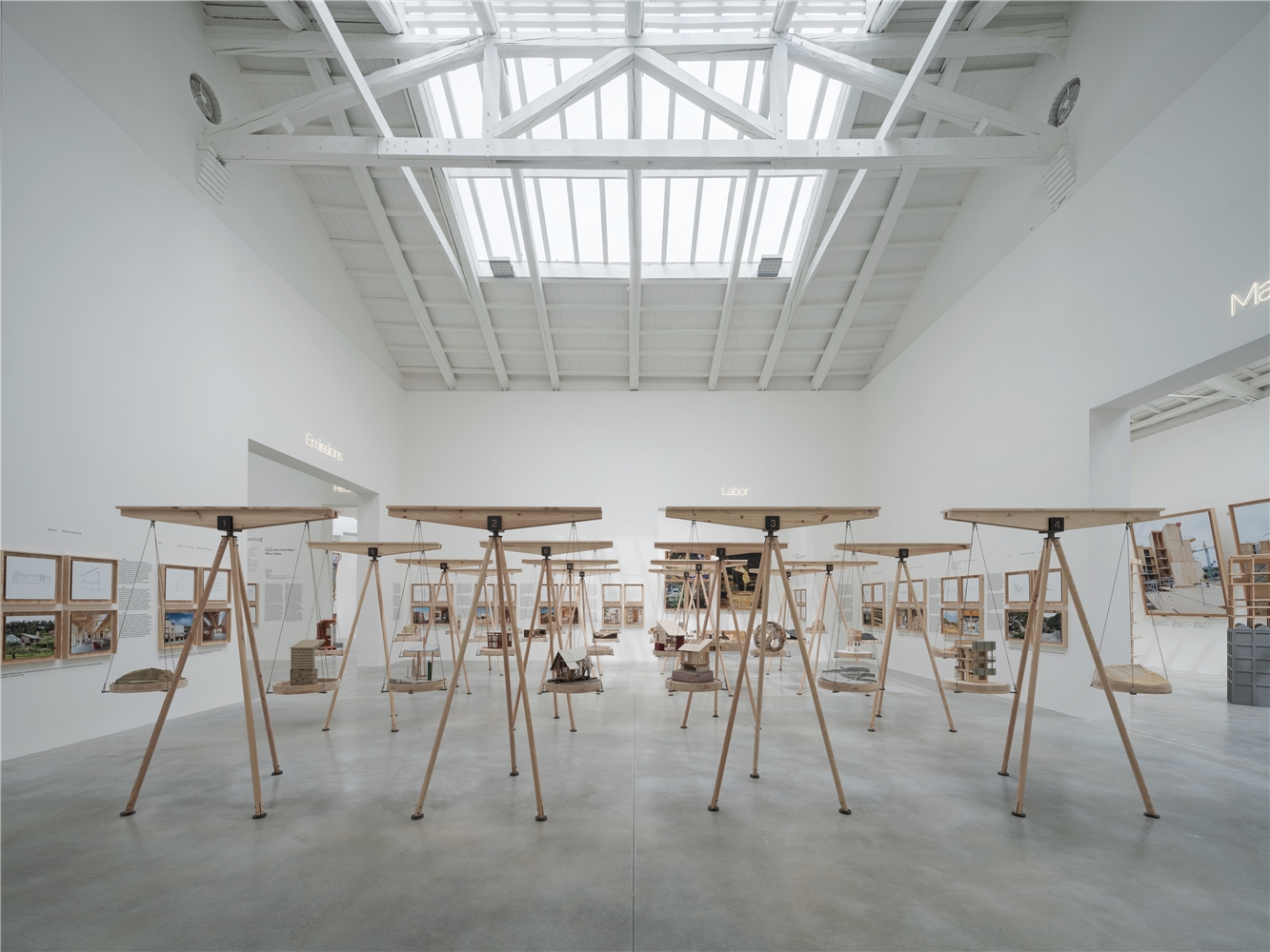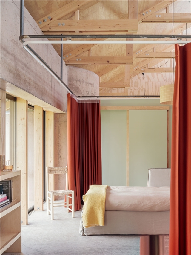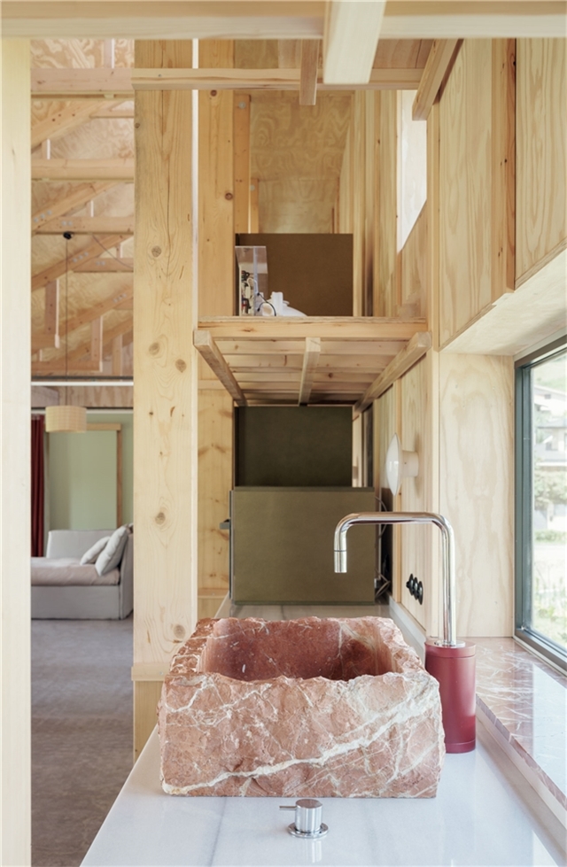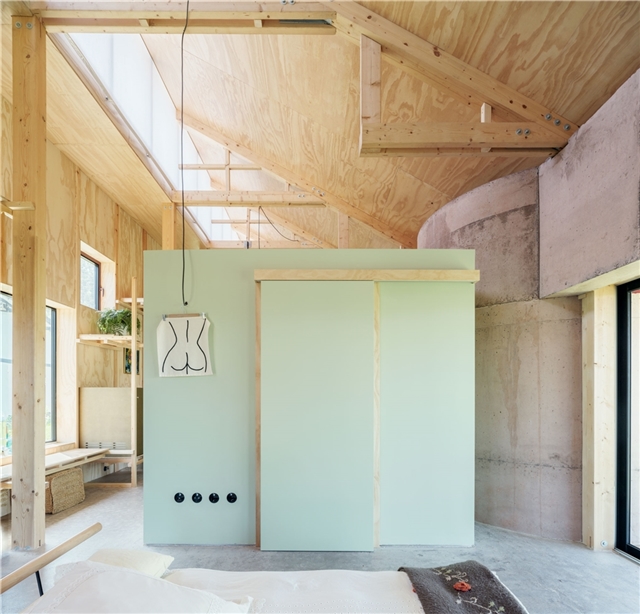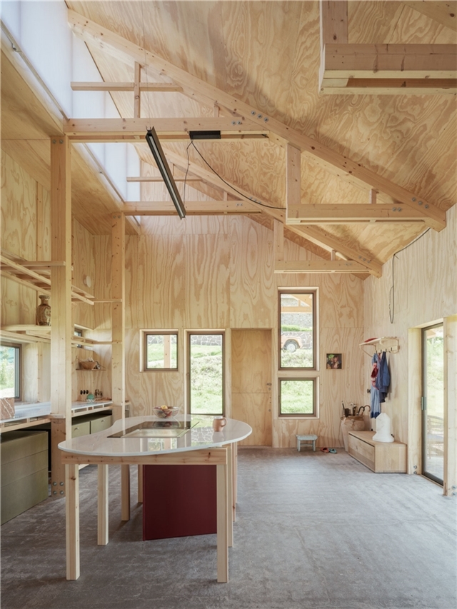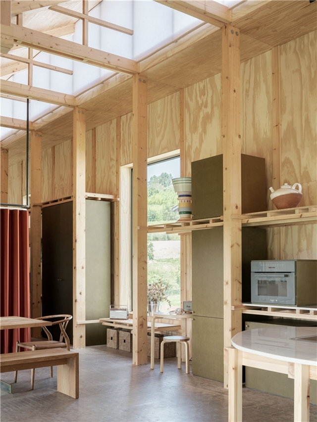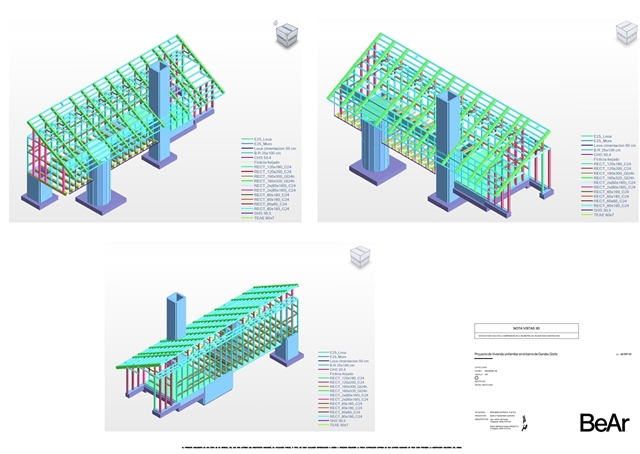 Nahinuena es tambien un proyecto alrededor de la madera. Ésta es estructura, interior, exterior, solado, forjado y mobiliario. Pero no solo es un catálogo más de madera en diferentes formatos , si no que explora de manera precisa la relación madera-uso para un consumo mínimo de material. Los pórticos interiores funcionan a tracción, evitando pandeos, posibilitando su ejecución con unas mínimas escuadrías de madera aserrada, los paneles estabilizan el conjunto de entramado ligero y se muestran como fachada o revestimiento interior, el forjado se resuelve con vigas laminadas y un tablero de virutas de madera que minimizan huella de carbono.