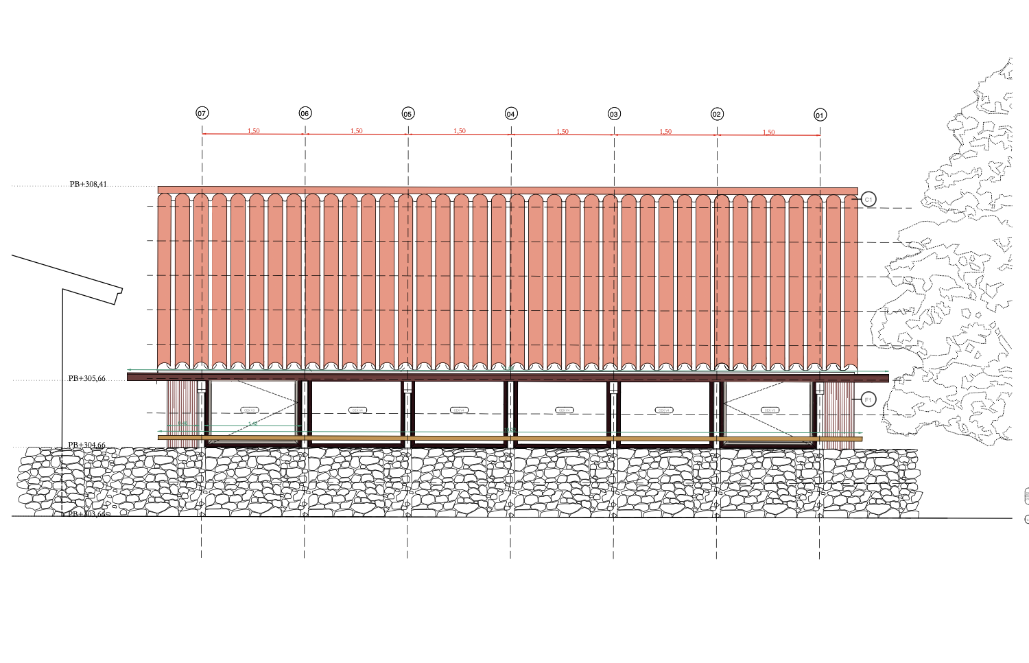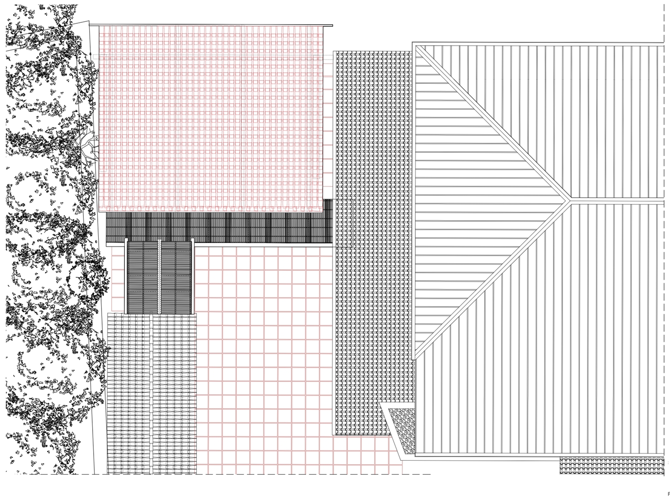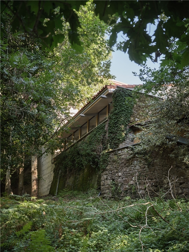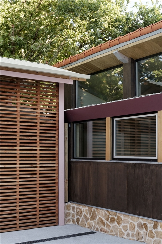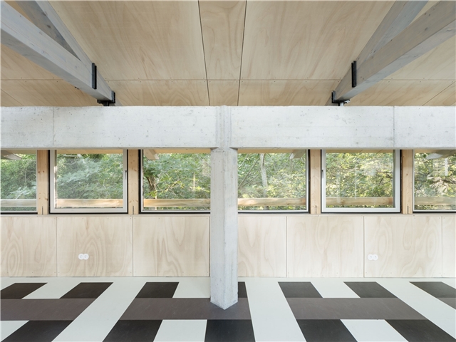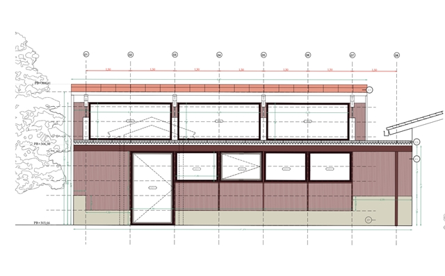 La edificación se apoya sobre un muro vegetalizado existente, al que se adosa sin modificar su condición. Esta decisión define tanto la implantación como la sección del edificio, que se concibe más como una pieza de conexión que como un volumen autónomo. El pabellón articula la relación entre las construcciones deportivas existentes y el paisaje natural, incorporando el bosque como telón de fondo constante.