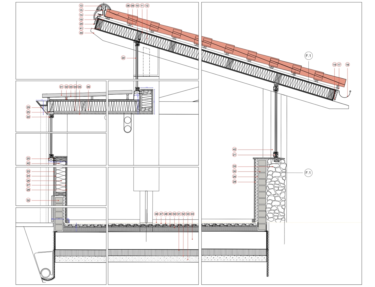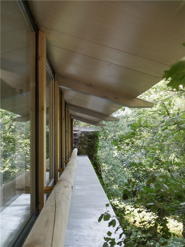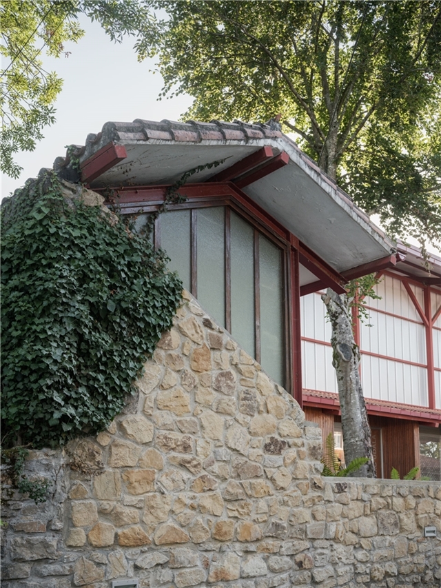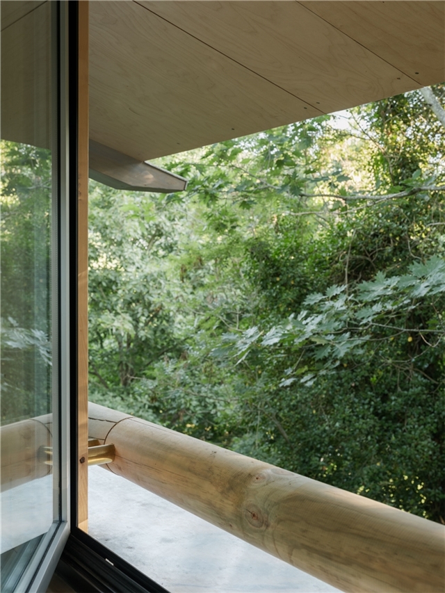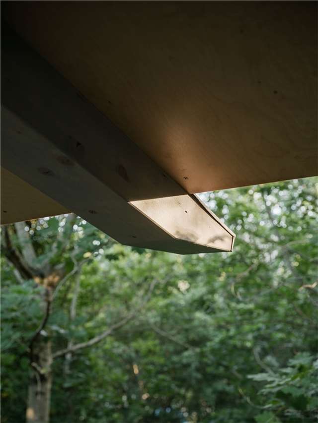La edificación se apoya sobre un muro vegetalizado existente, al que se adosa sin modificar su condición. Esta decisión define tanto la implantación como la sección del edificio, que se concibe más como una pieza de conexión que como un volumen autónomo. El pabellón articula la relación entre las construcciones deportivas existentes y el paisaje natural, incorporando el bosque como telón de fondo constante.
