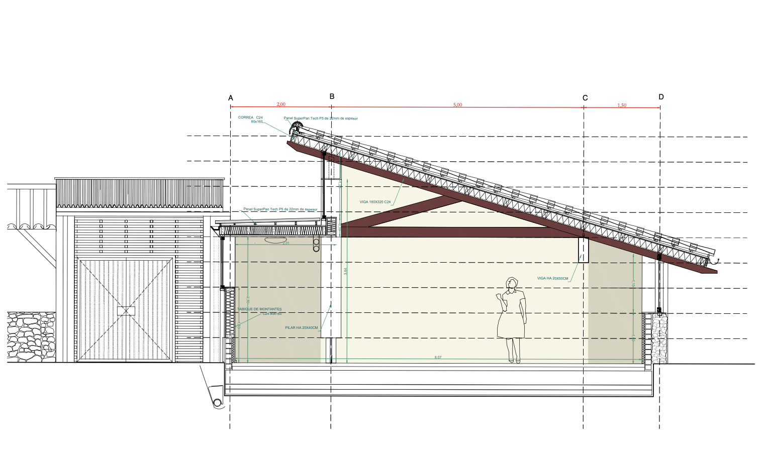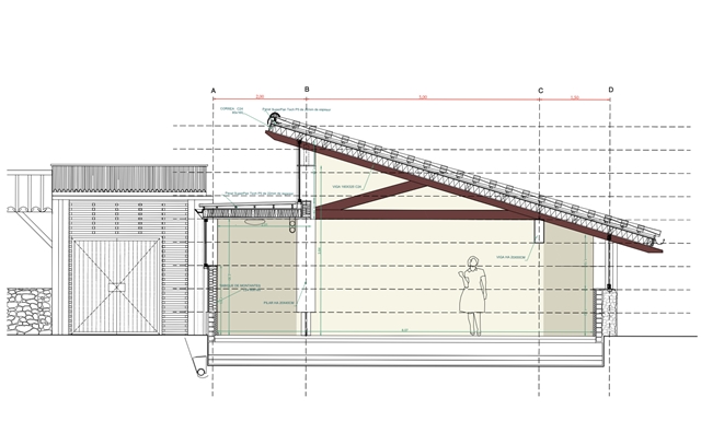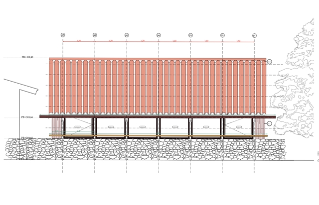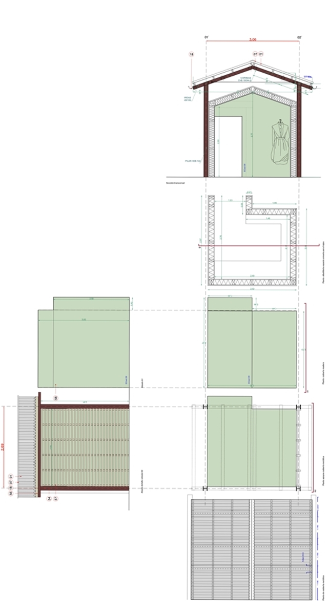 El proyecto se compone de dos partes que funcionan conjuntamente. Una de ellas alberga los espacios de apoyo necesarios para la actividad —almacenaje, vestuario y equipamiento—, resolviéndose como un volumen más cerrado. La otra se construye a partir de una estructura abierta que hace explícita la relación entre carga, sección y forma. Esta segunda pieza traslada una sección estructural reconocible para convertirla en arquitectura útil, sin ocultar su lógica constructiva.