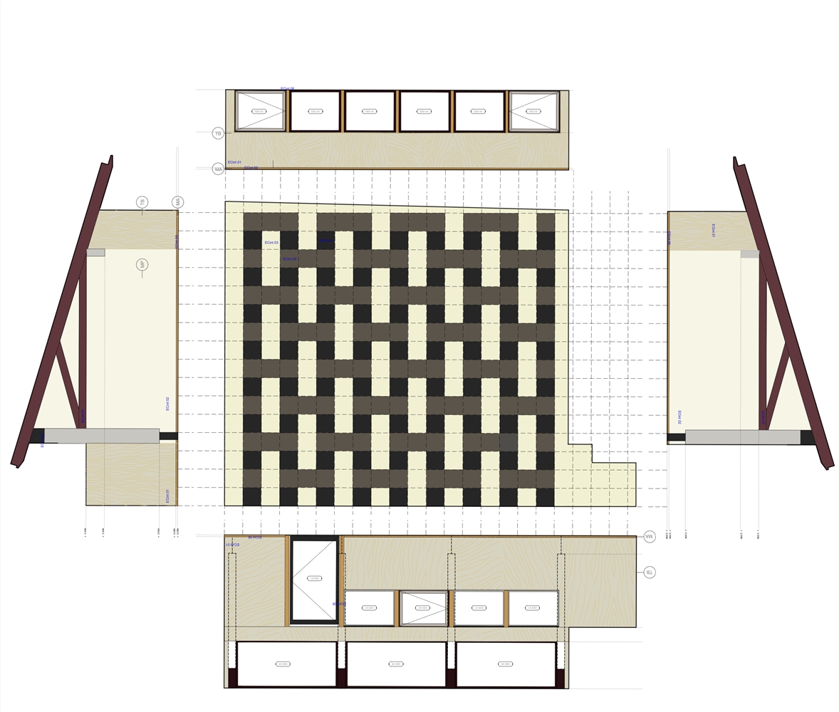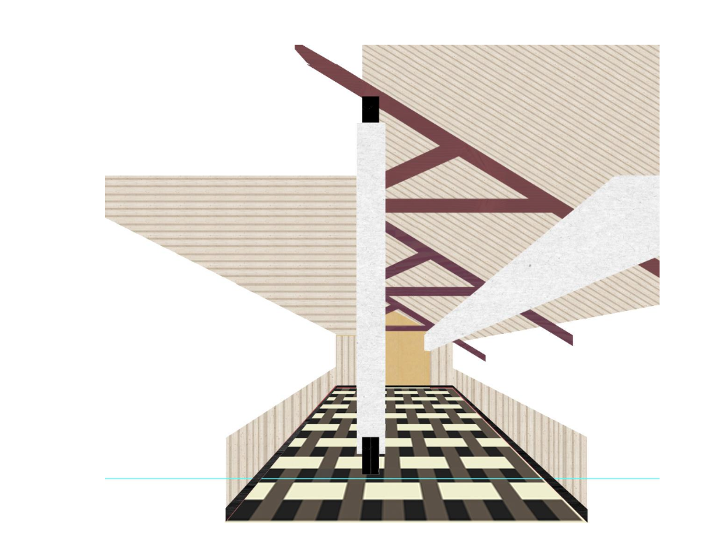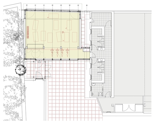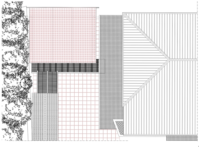 El proyecto se apoya en una operación inicial de colocación. No se eliminan las construcciones previas ni se reordena el conjunto desde cero. Se trabaja sobre lo que hay, limpiando, cosiendo y ajustando relaciones. El nuevo pabellón ocupa un “entre”, un espacio sin uso definido, y lo transforma en una plaza cubierta capaz de acoger actividades vinculadas al movimiento, el encuentro y el uso cotidiano.