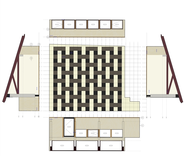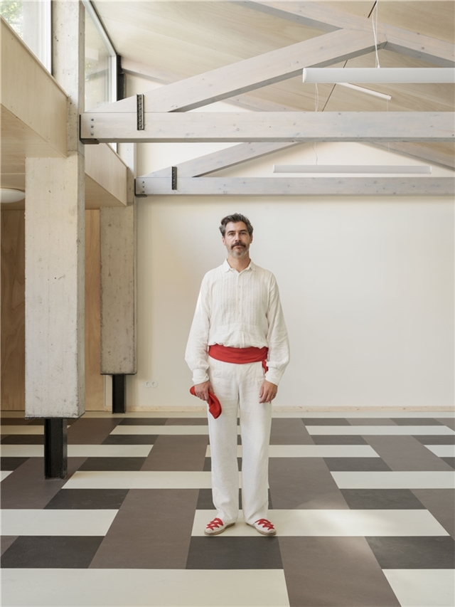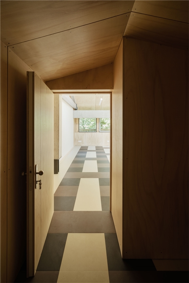 En el interior, los límites entre dentro y fuera se mantienen deliberadamente ambiguos. Los acabados se utilizan de manera continua, sin establecer jerarquías claras entre paramentos. El suelo introduce una mayor definición mediante una secuencia de paneles de color que ordena el espacio y acompaña el uso, estableciendo un ritmo que responde a la actividad de danza y gimnasia.