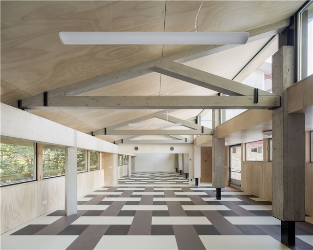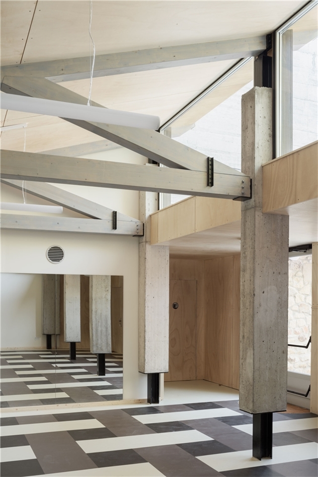 La estructura se mantiene visible y participa directamente en la configuración del espacio. Los elementos portantes no se recubren ni se disimulan, permitiendo que el sistema estructural forme parte de la experiencia interior. Esta condición resulta especialmente relevante en un edificio destinado a la práctica del movimiento, donde cuerpo y espacio se relacionan de manera directa.