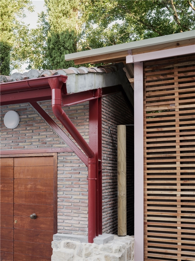 La materialidad del proyecto responde a criterios de coherencia con el entorno y con la escala de la intervención. Se emplean sistemas constructivos sencillos y reconocibles, adecuados a un equipamiento público de pequeño tamaño. La cubierta se resuelve mediante teja cerámica curva, reforzando la integración del pabellón en el paisaje construido del municipio y estableciendo una continuidad visual con la arquitectura existente.