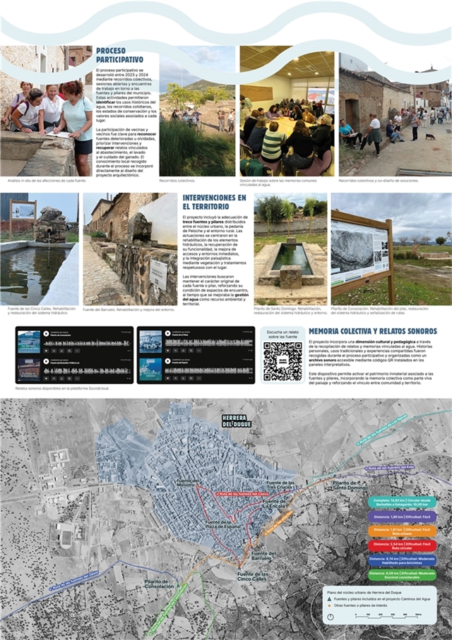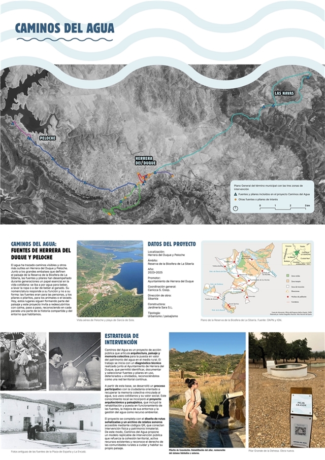 Caminos del Agua es un proyecto desarrollado en el municipio de Herrera del Duque y su pedanía de Peloche, en el ámbito de la Reserva de la Biosfera de La Siberia, que aborda la puesta en valor de fuentes y pilares como una red territorial vinculada al agua, al paisaje y a la vida cotidiana del medio rural. El proyecto entiende estos elementos no como restos patrimoniales aislados, sino como una infraestructura histórica que ha articulado durante generaciones los usos domésticos, productivos y sociales del territorio.