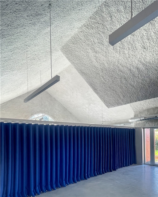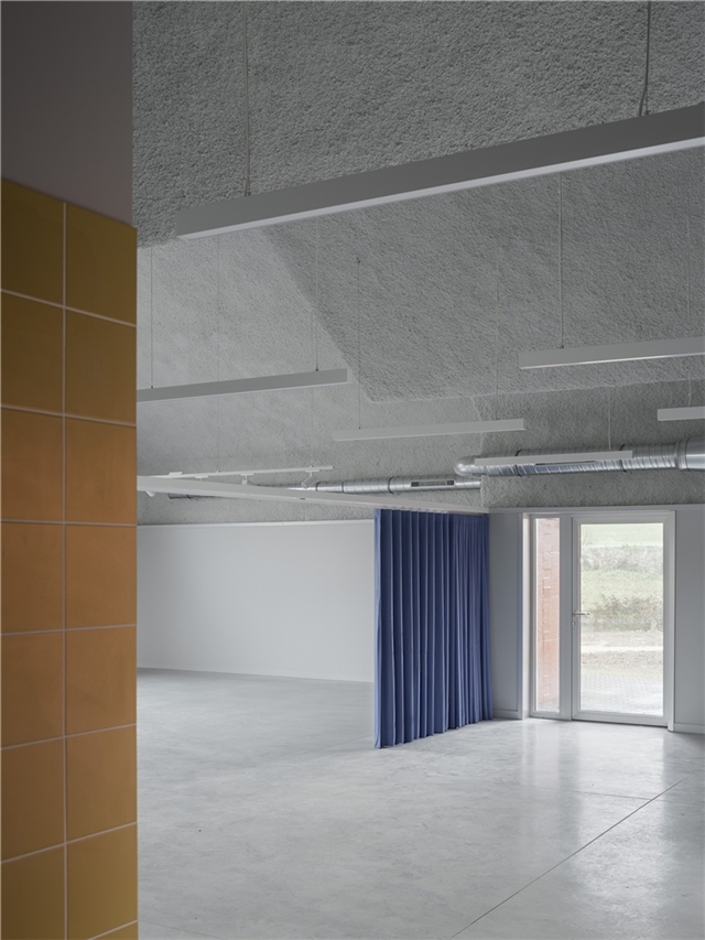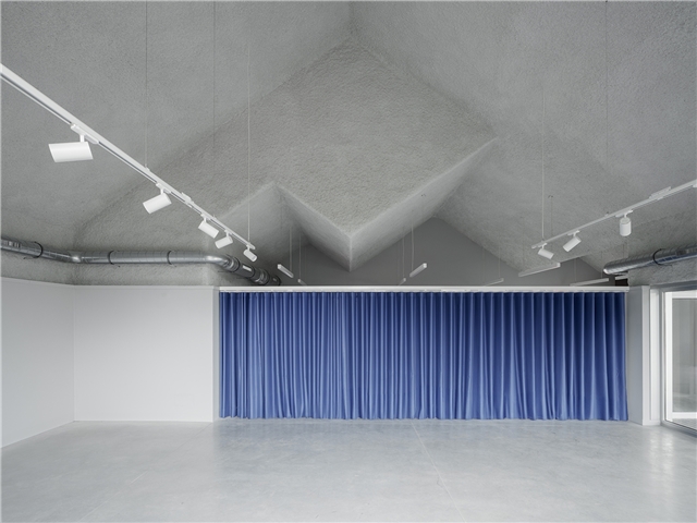 El edificio alberga un salón de actos, un espacio expositivo y una pequeña cocina, organizados bajo una cubierta plegada de hormigón armado que unifica el conjunto. El pliegue cualifica los distintos usos mediante variaciones de altura y luz, manteniendo la continuidad espacial y la percepción de un único ámbito común.