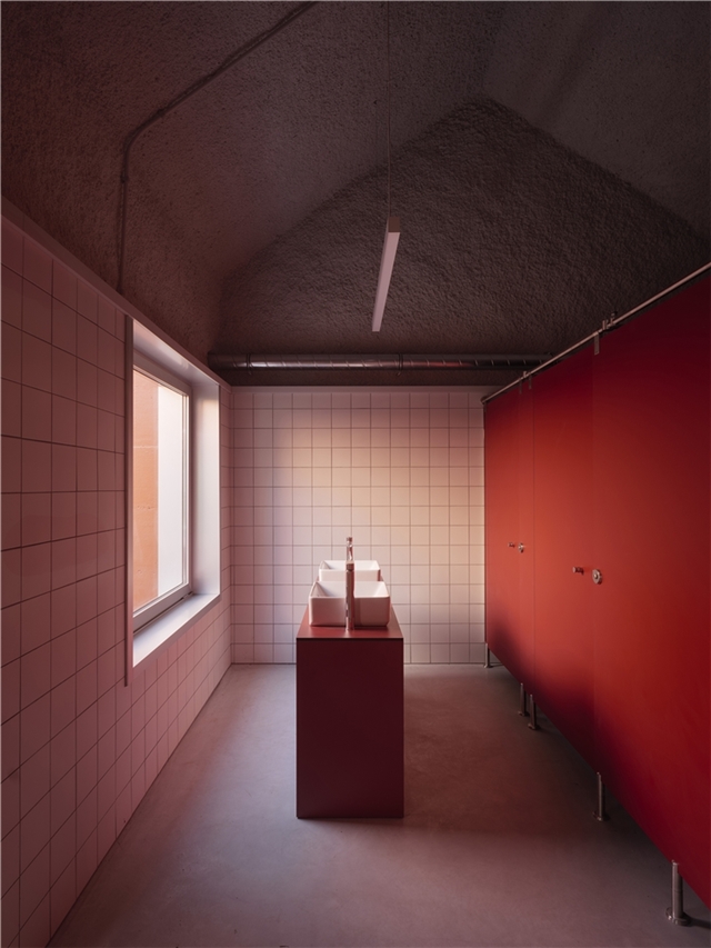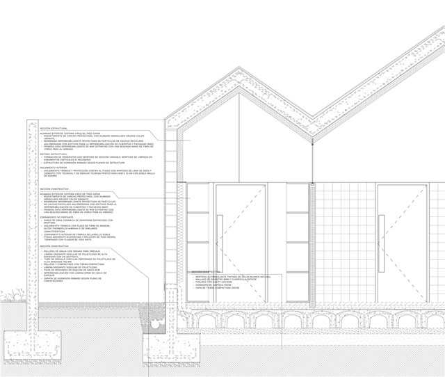 Con el fin de hacer la obra lo más eficiente y económica, la cubierta lleva el mínimo material: un proyectado impermeabilizante exterior rojo y un proyectado aislante de lana de roca interior. Ambos son, a la vez, acabados.