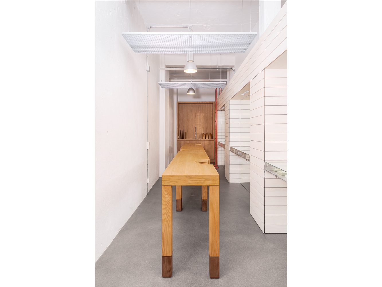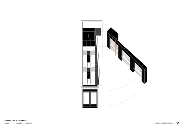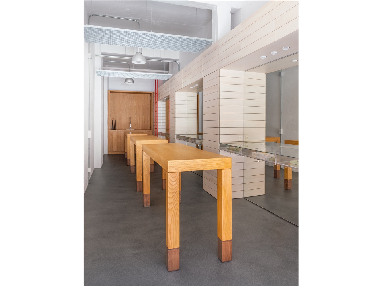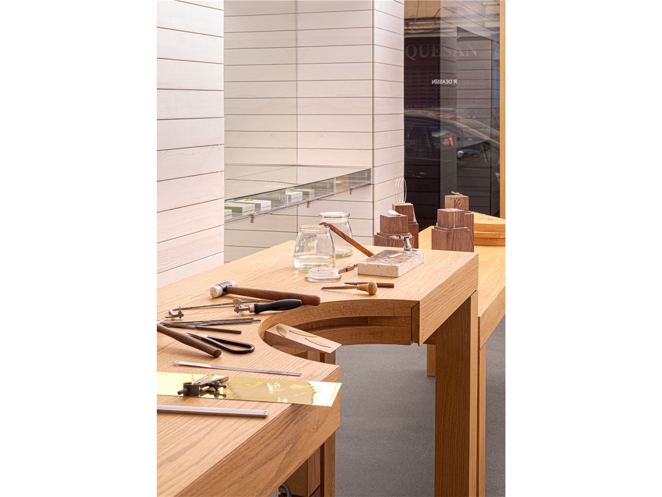La propuesta opera de manera trans-escalar: de la joya al objeto, del objeto al mueble, del mueble al espacio y del espacio a la ciudad. Esta lógica se materializa a través de dos elementos históricamente ligados a la joyería: la mesa y el cajón. Un sistema de mesas transformables en superficie y altura revisita la mesa tradicional de joyería y articula los procesos de diseño, fabricación y venta, pudiendo combinarse para talleres, ventas privadas o eventos. Paralelamente, un dispositivo lateral continuo resuelve el almacenamiento mediante cajones y armarios ocultos, integra baño y climatización, corrige las irregularidades del local e incorpora tres espejos a modo de “ventanas” interiores que amplifican la percepción espacial y evocan una logia pública. De ellas se suspenden vitrinas transparentes que exponen piezas singulares y construyen una narrativa a lo largo del espacio.